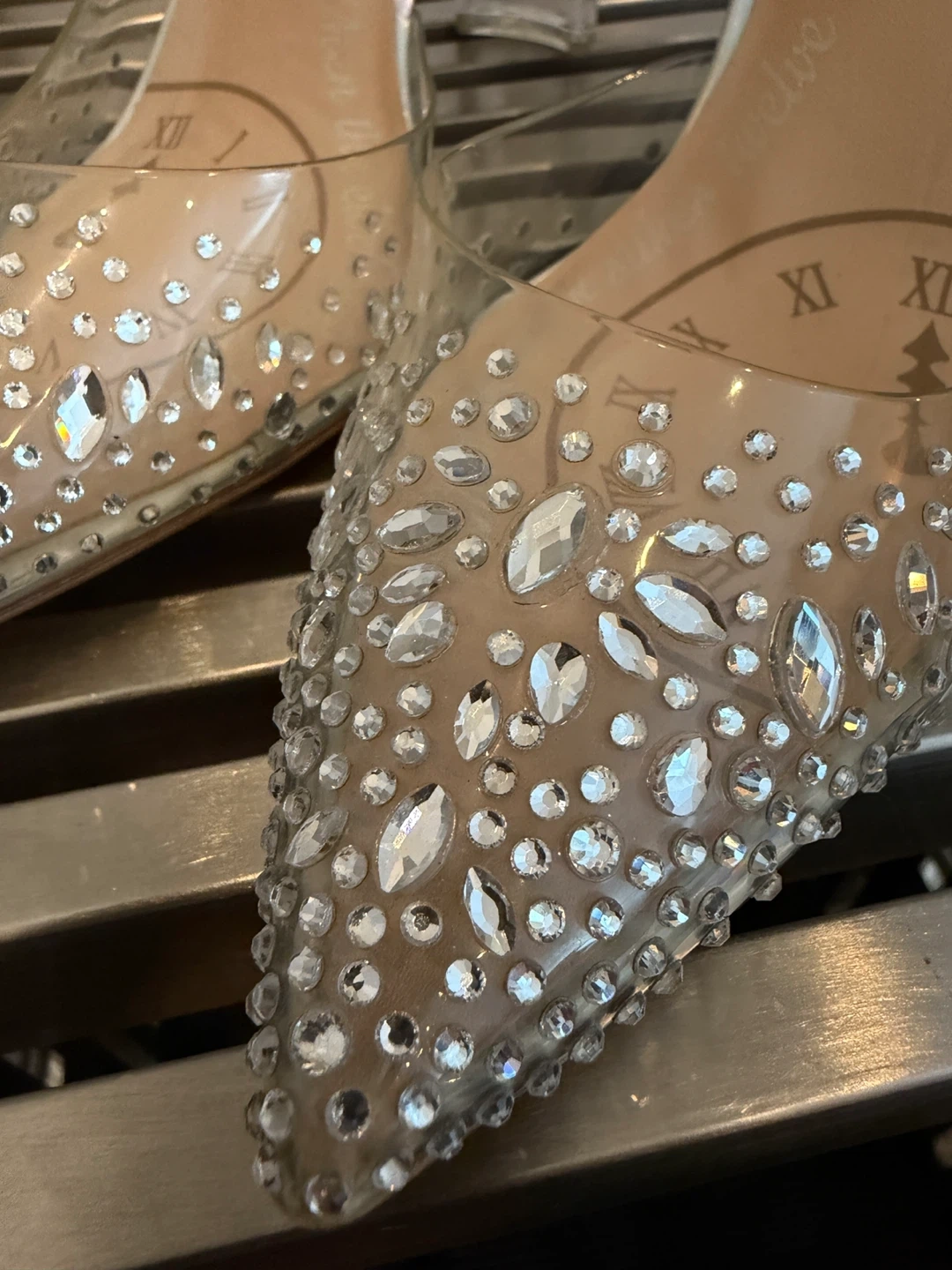 These limited edition stunning heels are a collaboration between Aldo and Disney, inspired by Cinderella's glass slippers. They feature a clear, pointed toe design embellished with rhinestones and a transparent slingback strap. The soles have a clock face graphic and text that reads 'When the clock strikes twelve'. Brand New, Never worn. Size 8 US. Heel Height 4 inches (10 cm)