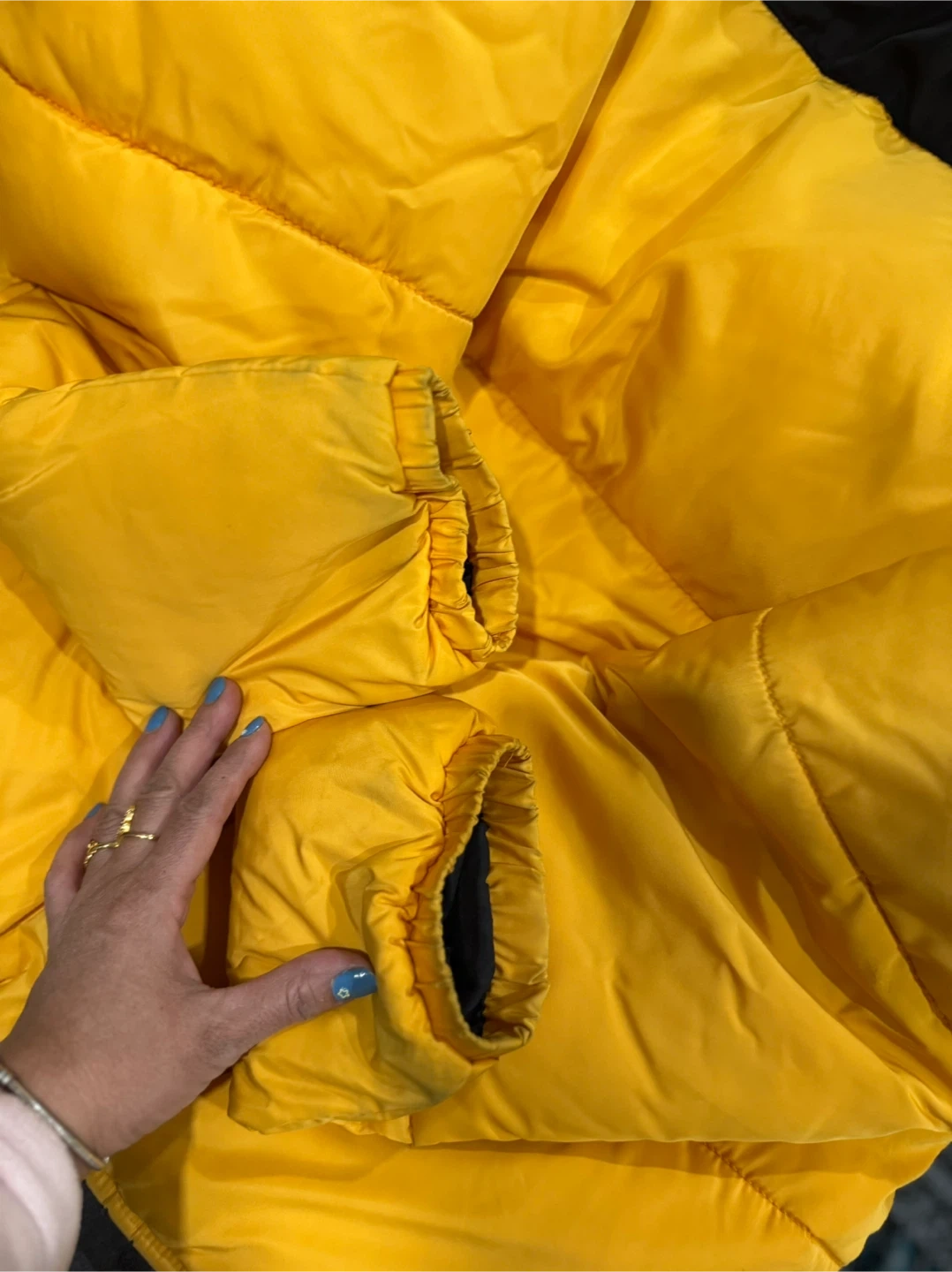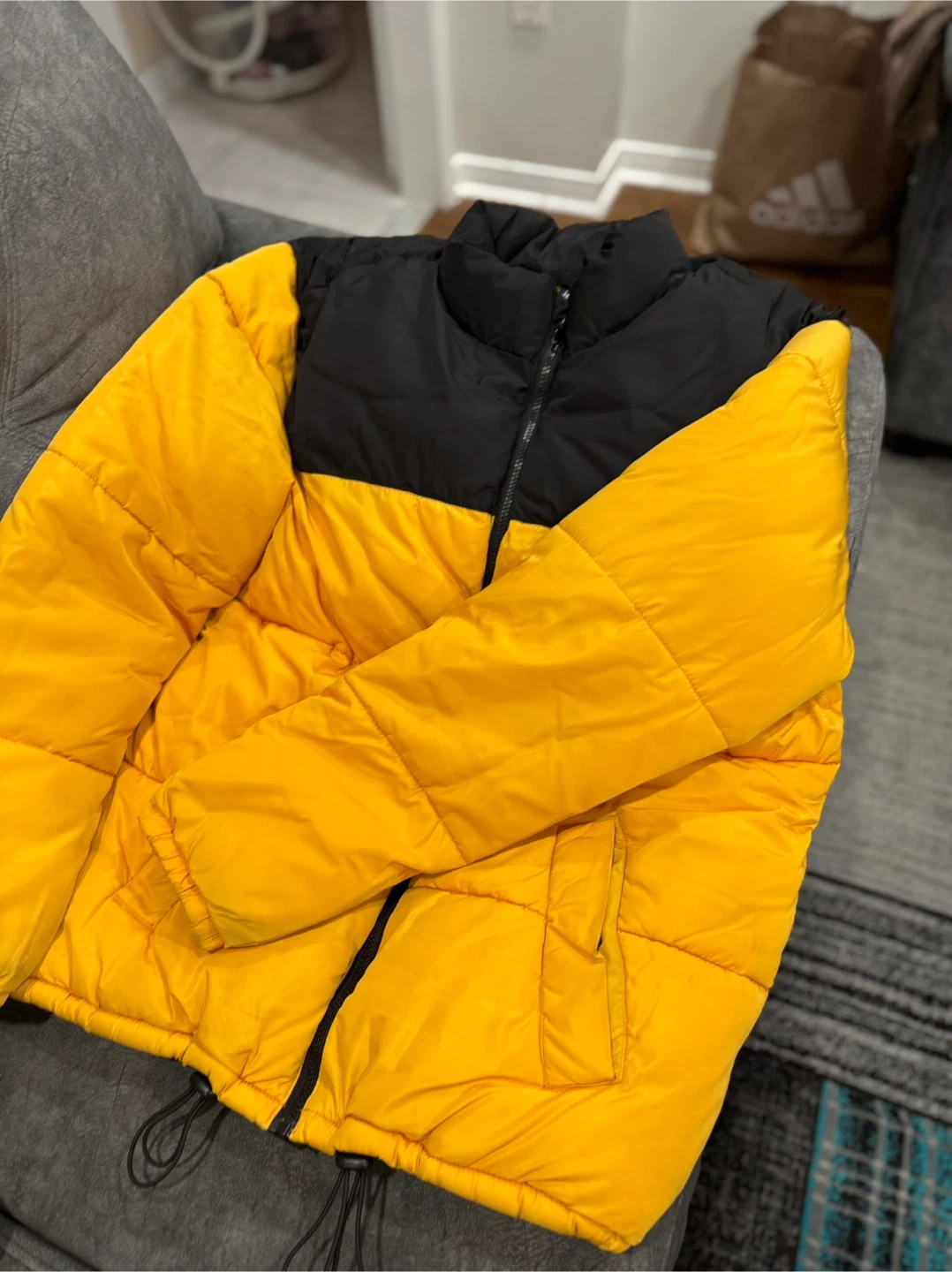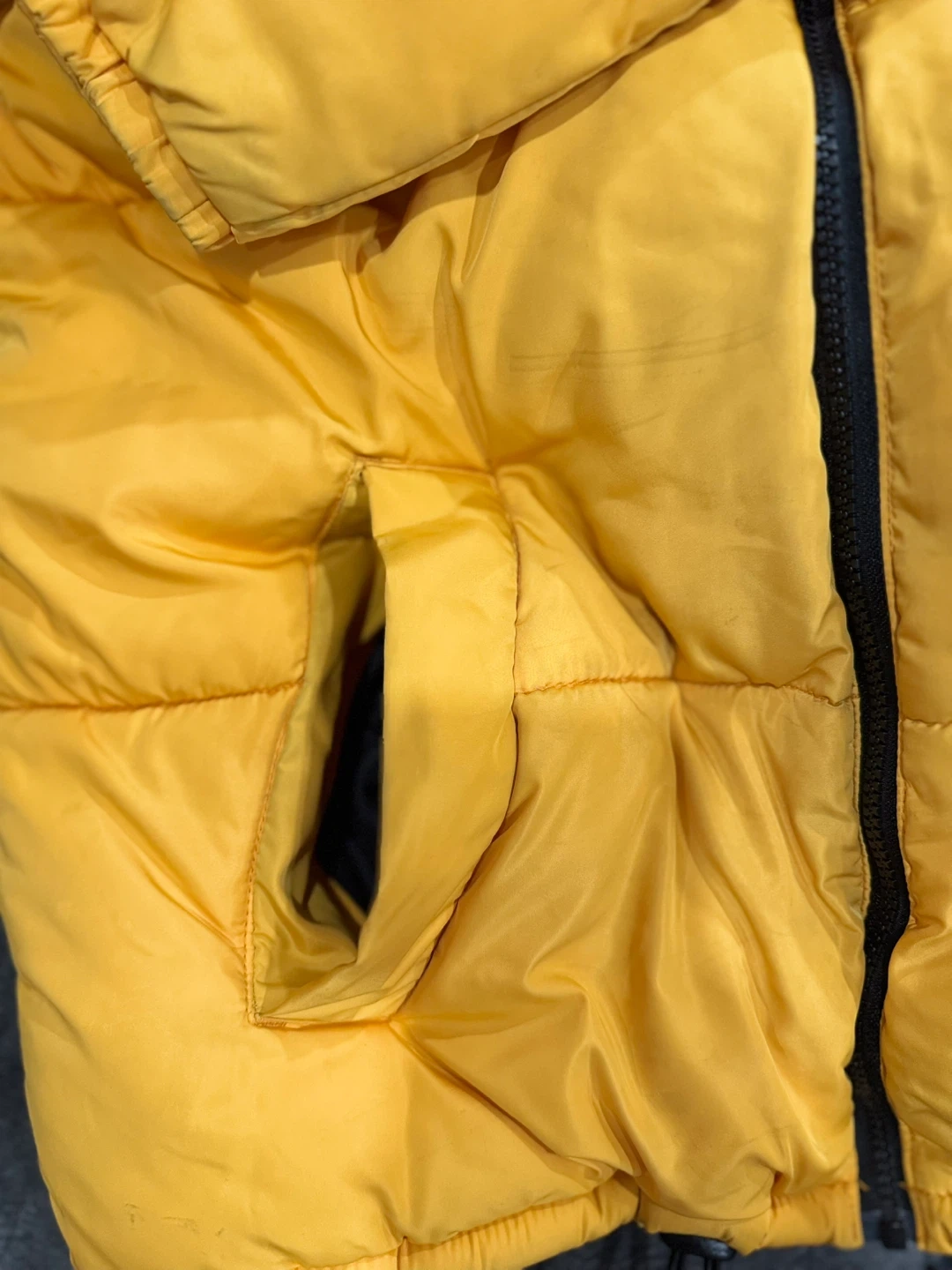 This is a stylish puffer jacket from Divided by H&M. It features a bold black and yellow colour block design. The jacket is insulated for warmth, perfect for cooler weather! One Pocket inside jacket.