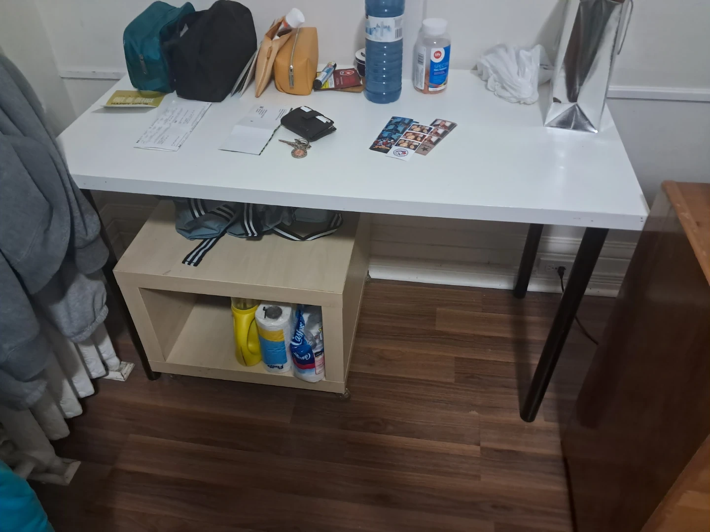 A simple white desk with black metal legs. It's a good size for a home office or study space. There's a small storage cube underneath with cleaning supplies.