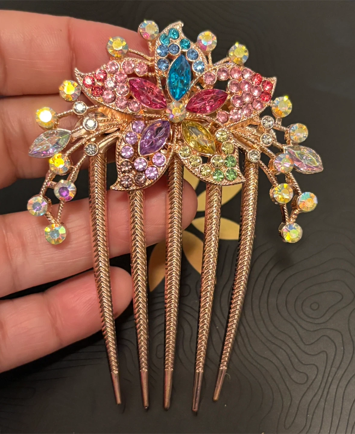 Gorgeous hair comb adorned with colourful rhinestones in a floral design. It's a beautiful accessory for special occasions or to add some sparkle to your everyday look!