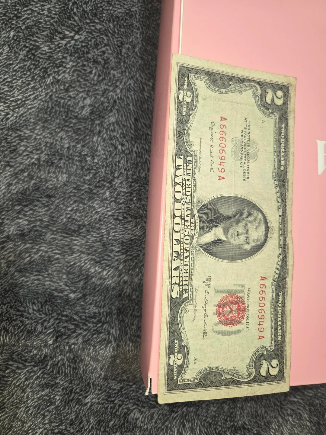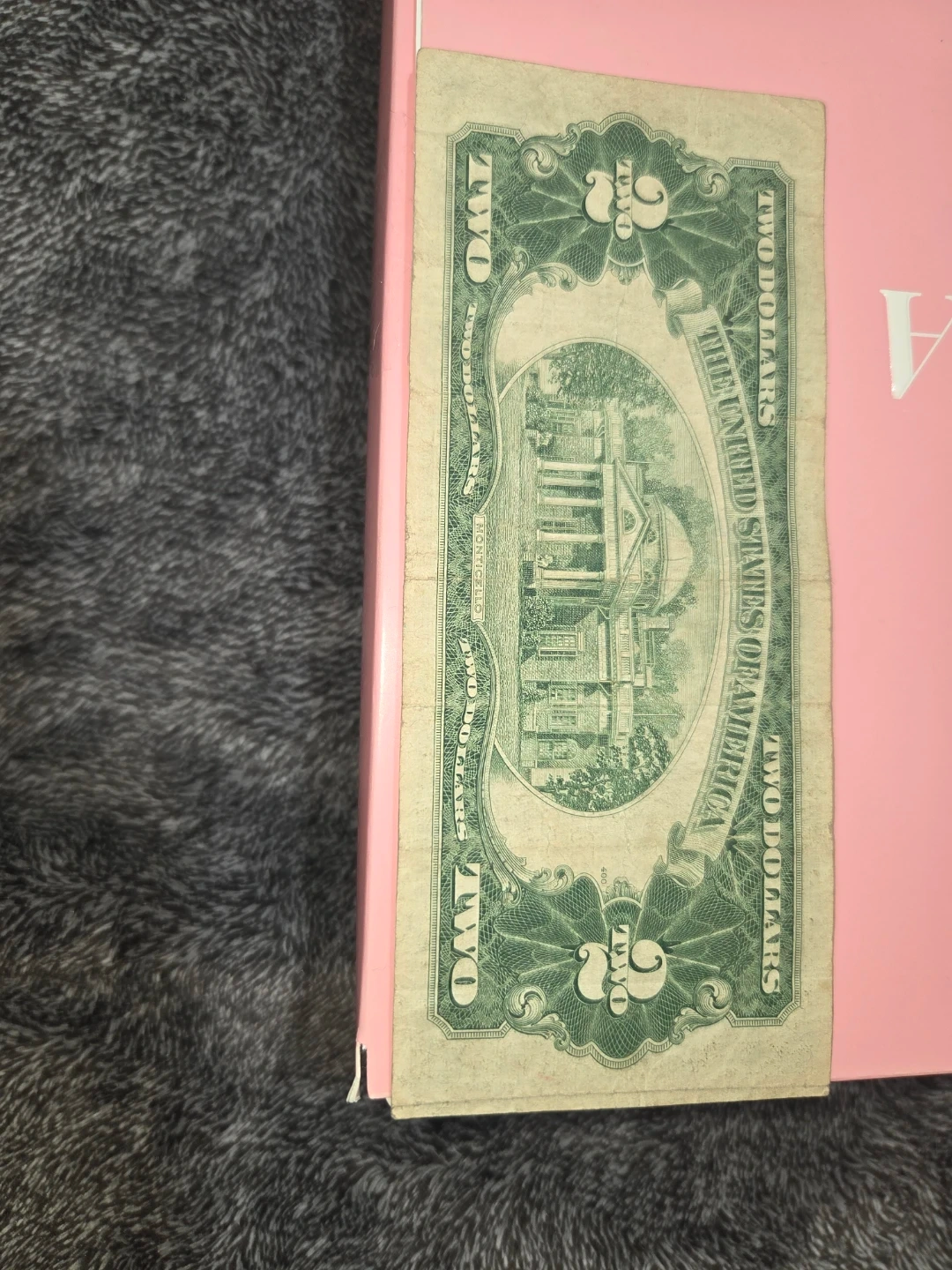This is a two-dollar bill from the United States of America. It features Thomas Jefferson on the front and Monticello on the back. A great addition for any collector!