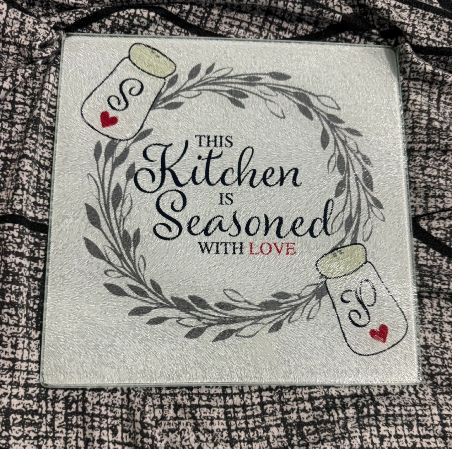 Glass cutting board featuring a decorative design that reads "THIS Kitchen IS Seasoned WITH LOVE". It has a textured glass surface with graphics of salt shakers and a laurel wreath. Perfect for adding a touch of charm to your kitchen décor!