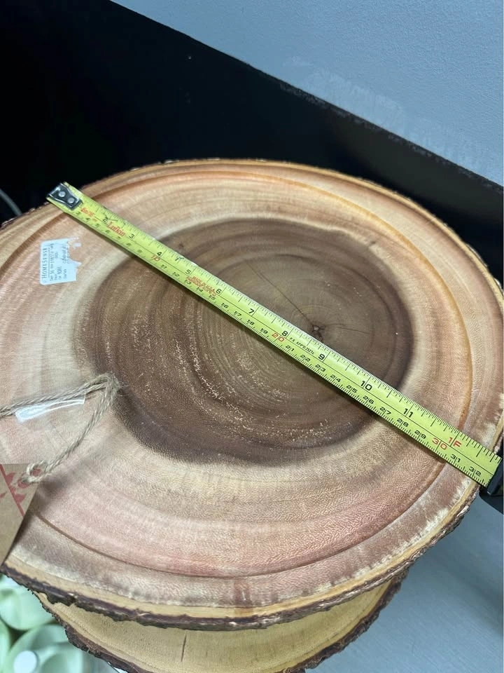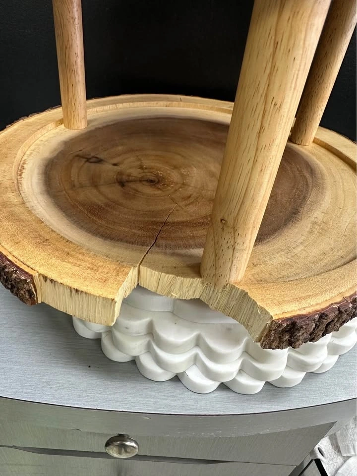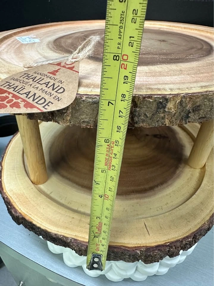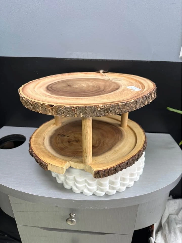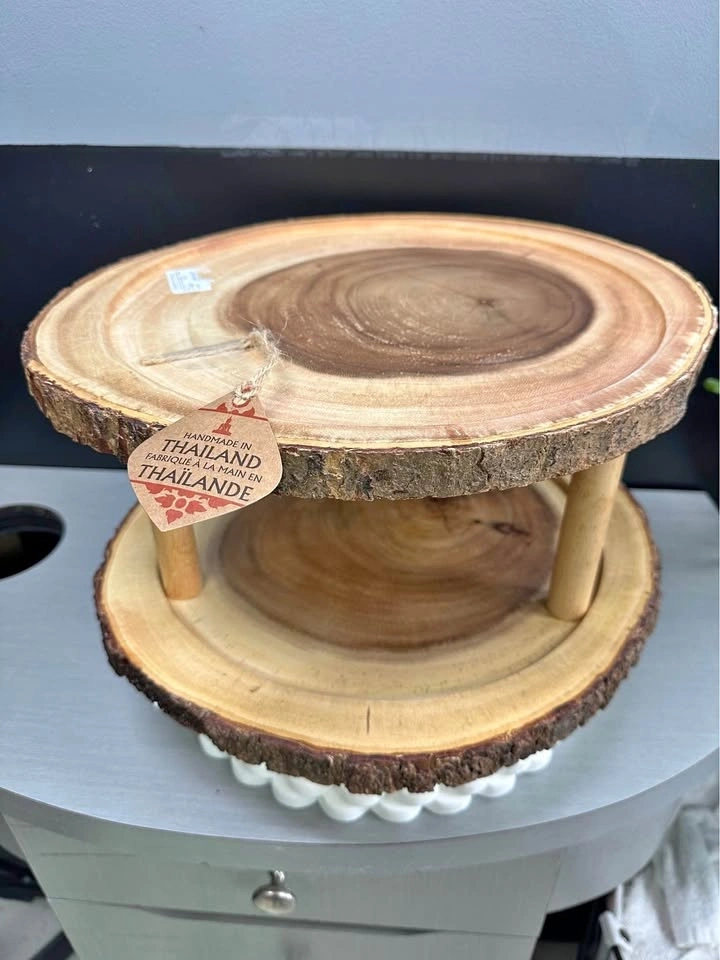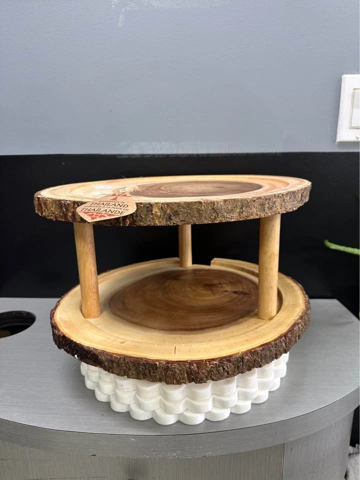 Rustic two-tier display stand made from natural wood slices with beautiful live edge detailing. Handmade in Thailand, great for showing off desserts or unique decor. Does have a piece broken off. See pictures.