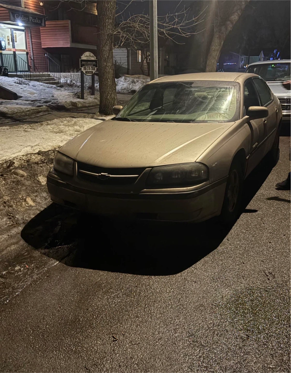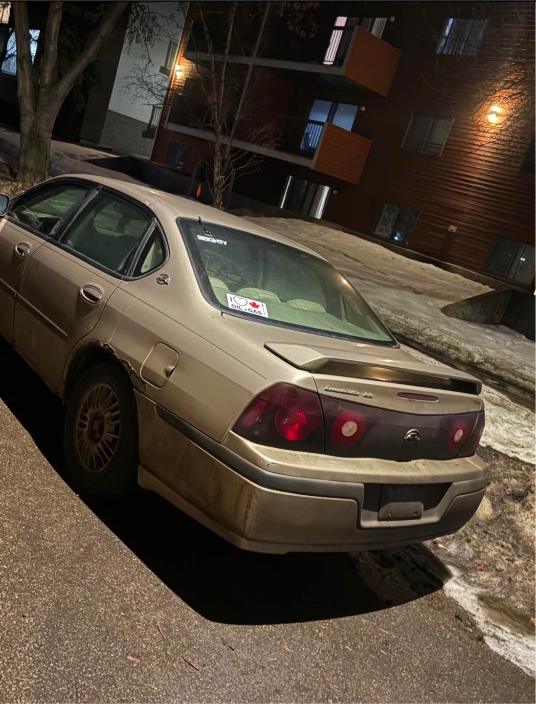 Tan Chevy Impala LS. Has light Grey leather interior. Some body damage on drivers side under the door as the panel came off. Car is dirty from being outside but was recently washed before the cold hit again as well as cleaned inside, but it will be dirty again as it’s my daily driver. It’s been a good reliable car and she’s started every time even with the wicked cold snap we got. She’s got some rust and some small minor issues that are easy to fix, the Engine is perfectly fine so is transmission, drives and shifts perfectly fine. Check engine light is on due to an o2 sensor, and its needs an oil change and a passenger side wiper blade, but other then that runs and drives like a charm she’s not let me down yet for a 22 year old car it’s fun, very gas efficient just needs a bit of cosmetic TLC or would be a great starter car for someone just leaving to drive. It will also come with a AM/FM transmitter to connect to your phone to play music or to receive phone calls, I have also put work into it like very recently replaced the brakes all around, fixed the wheel bearings, as well as the exhaust as it had bolt snap off. Also had to get a tire replaced as the previous owner didn’t let me know or didn’t know themselves but it’s all been fixed, kms are 211070. Asking $ 2000 or may consider trades on something manual, or that has command start and Bluetooth just no trucks or vans please. serious inquiries only please!!.