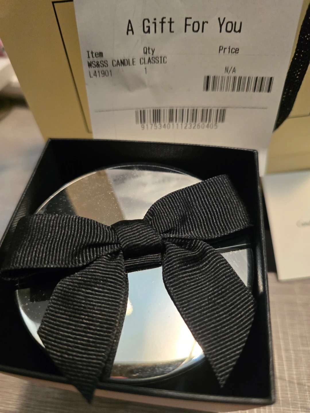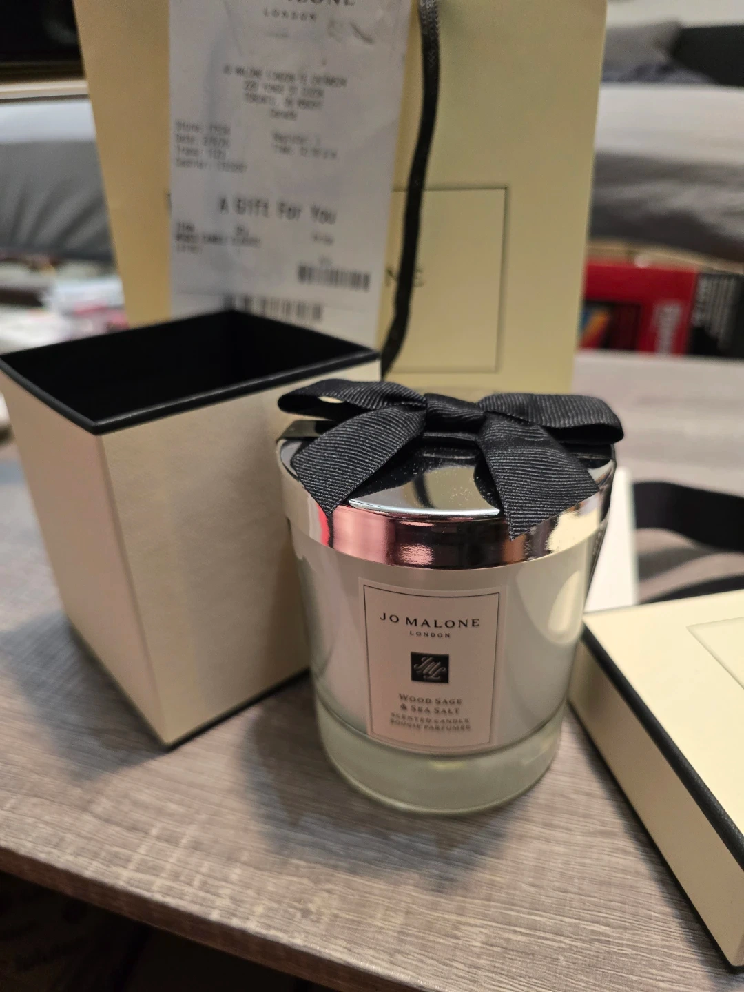 Jo Malone London Wood Sage & Sea Salt Classic Candle. It's in a glass container with a silver lid, tied with a black ribbon. Includes original packaging.