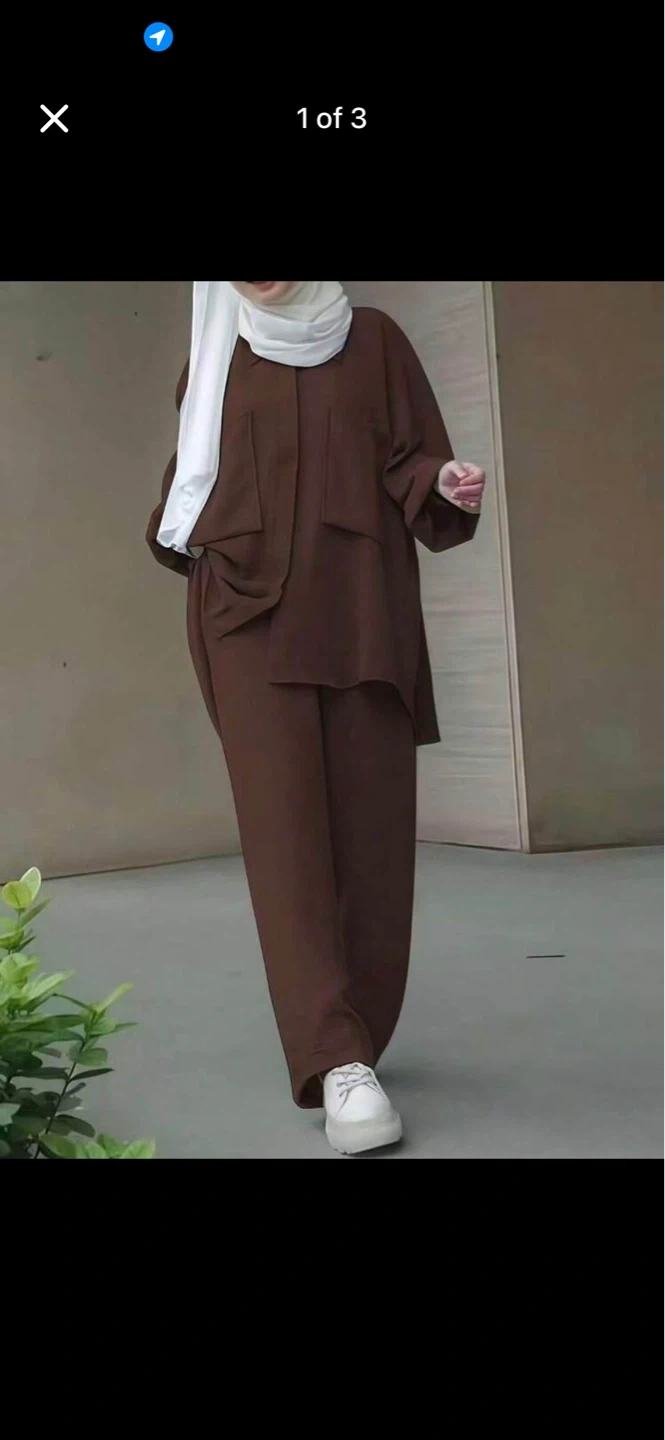 This is a stylish brown two-piece outfit. It's made from a comfortable, flowing fabric. The set includes a loose-fitting top and matching wide-leg pants.