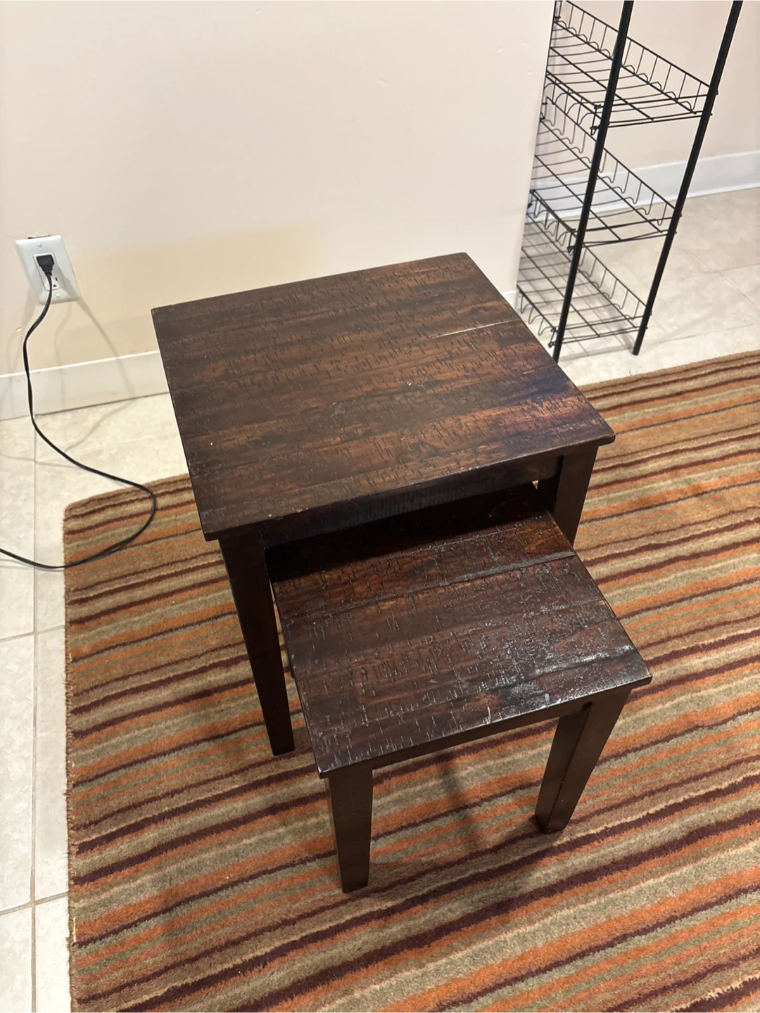 A set of two dark wood nesting tables. These tables have a rustic distressed finish and a space-saving design. The larger table measures approximately 20" tall and the smaller table fits underneath.