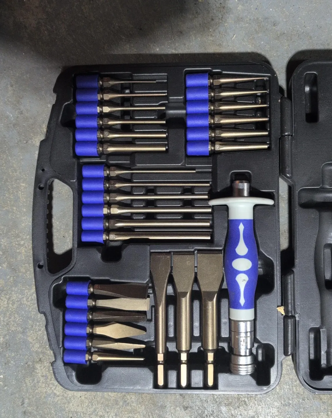 This Industro punch set comes with a variety of chisels and punches in a durable carrying case. It includes multiple pointed and flat chisels, along with several punches. The set is great for various metalworking and construction tasks.