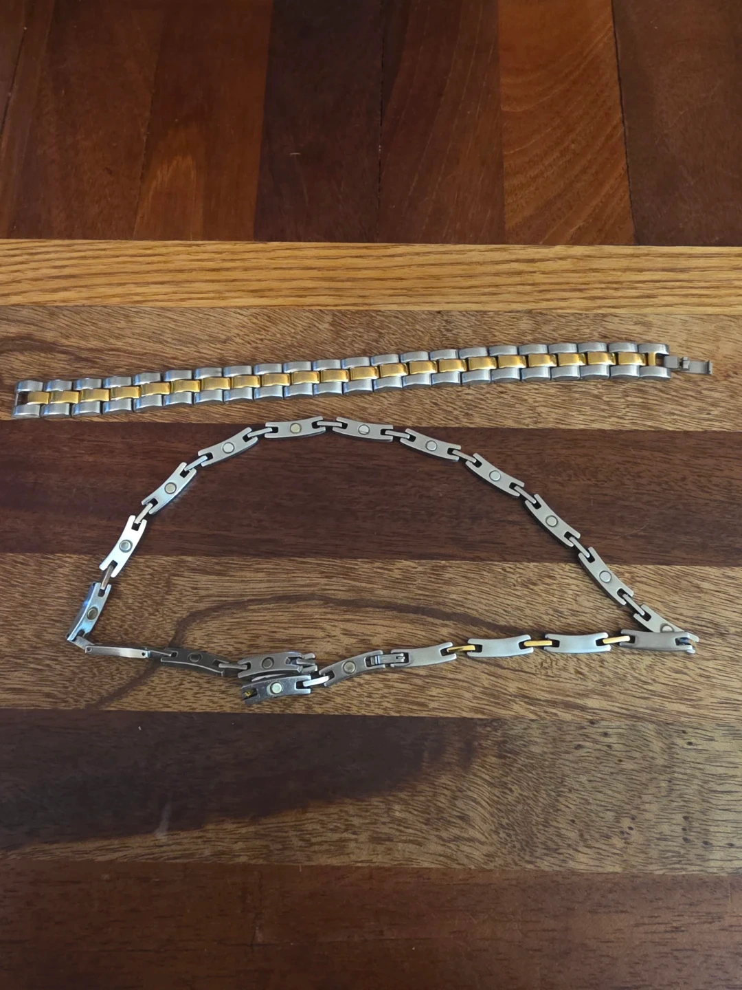 A set of two chain bracelets. One is a simple silver and gold tone link bracelet. The other is a silver tone chain with small circular accents and gold tone detailing.