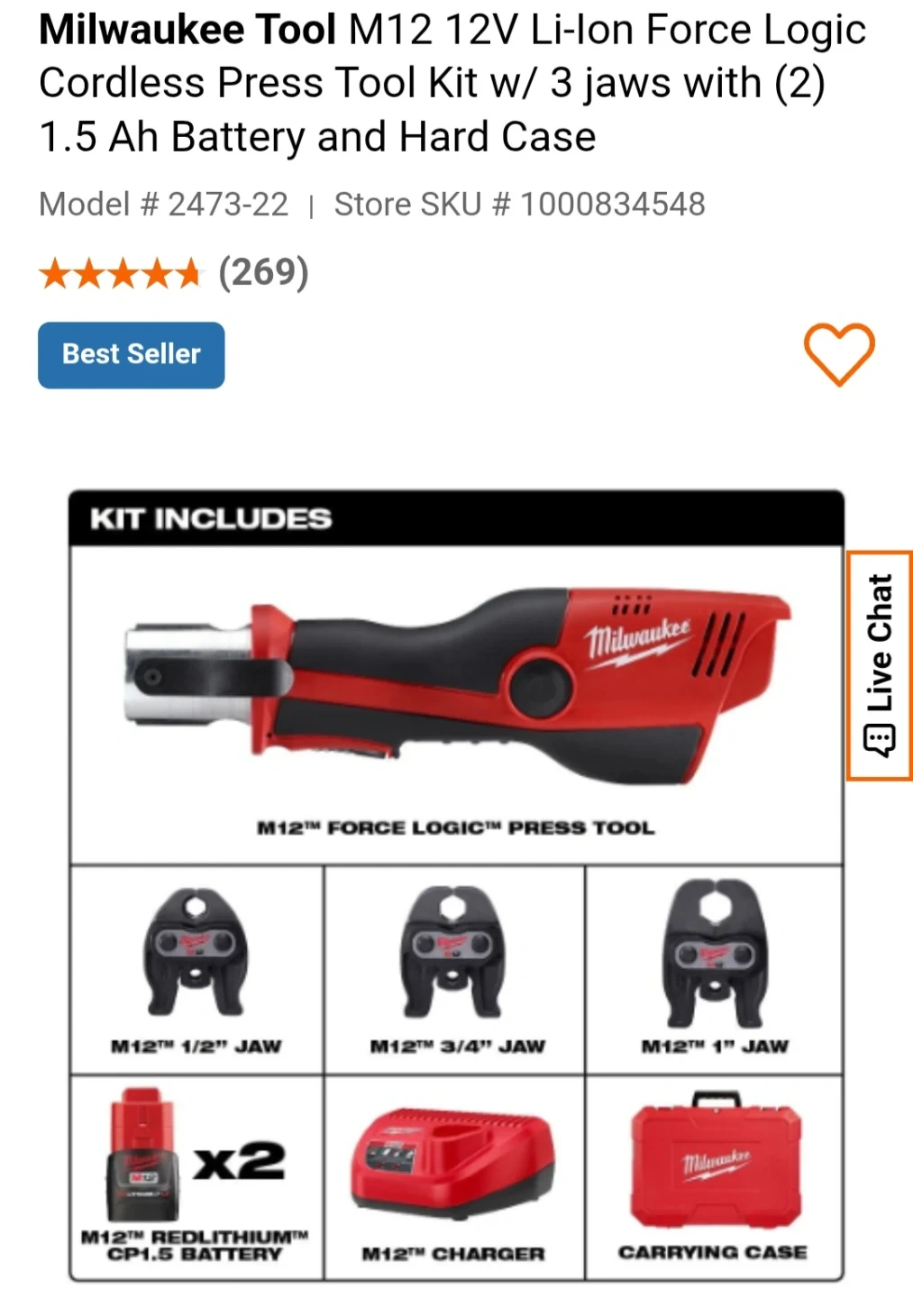 The Milwaukee M12 FORCE LOGIC Press Tool Kit with Jaws is the lightest press tool on the market and represents a new level in portability and accessibility around installed pipe. The M12 press tool features a one-handed, in-line design enabling users to operate the tool nearly anywhere they can fit your arm. Built-in REDLINK technology enables the press tool to monitor the force output, delivering users with quality connections. A visual indicator alerts users when a secure connection has been achieved and when the tool needs calibration. The cordless press tool features the best calibration standards, only requiring service every 32,000 crimps. When used with Milwaukee's M12 FORCE LOGIC Press Jaws, this tool delivers quality press connections on all major fitting brands including Viega ProPress Systems, Elkhart APOLLOXPRESS and Grinnell G-Press copper systems. In addition to the press tool, this kit includes two M12 REDLITHIUM CP1.5 battery packs; 1/2 -inch, 3/4 -inch and 1 -inch M12 jaws