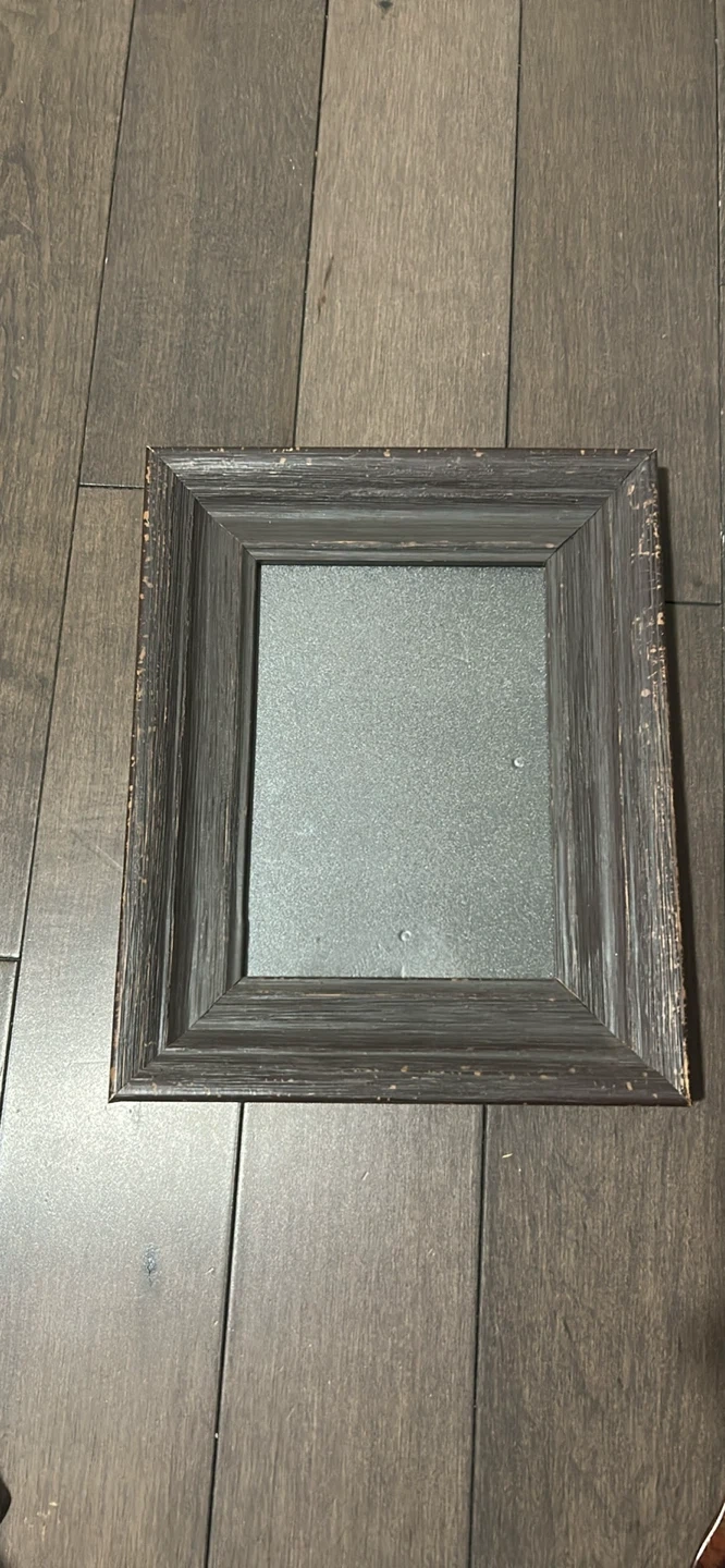 A dark wood picture frame with a distressed finish. Frame dimensions are approximately 11x9 inches externally. This frame would be great for displaying photos or art!