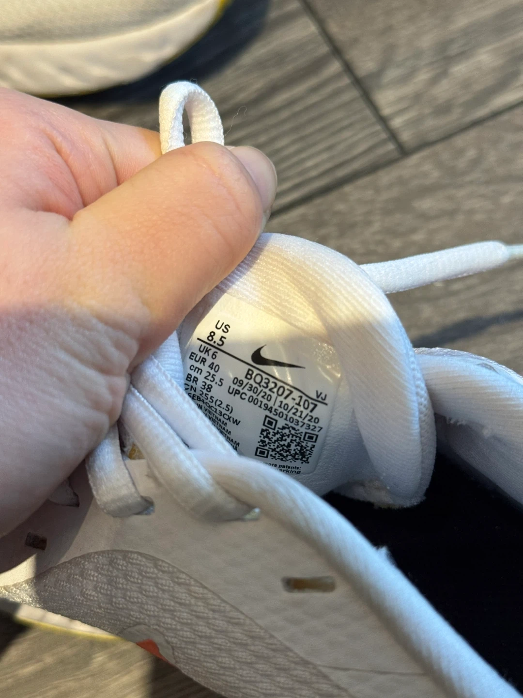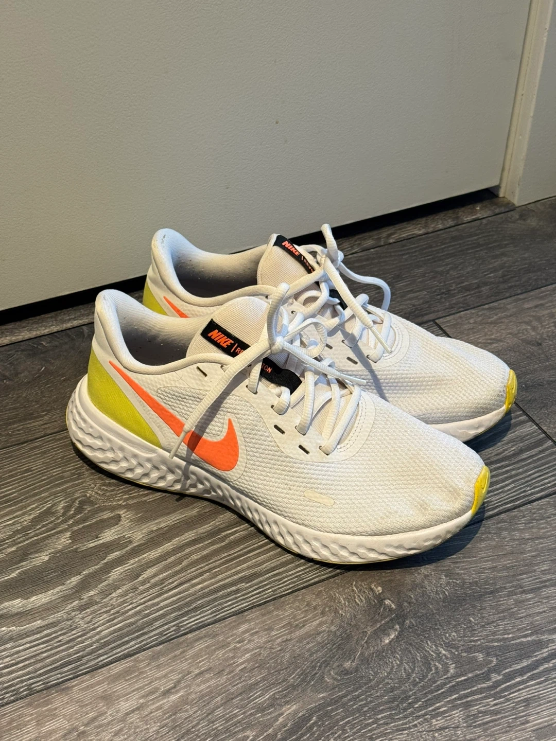 White Nike Revolution 5 running shoes with orange and yellow accents. These are a women's US size 8.5 (EUR 40).