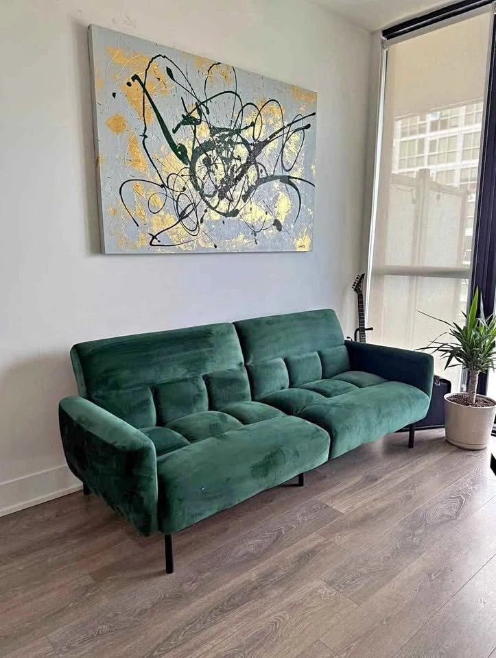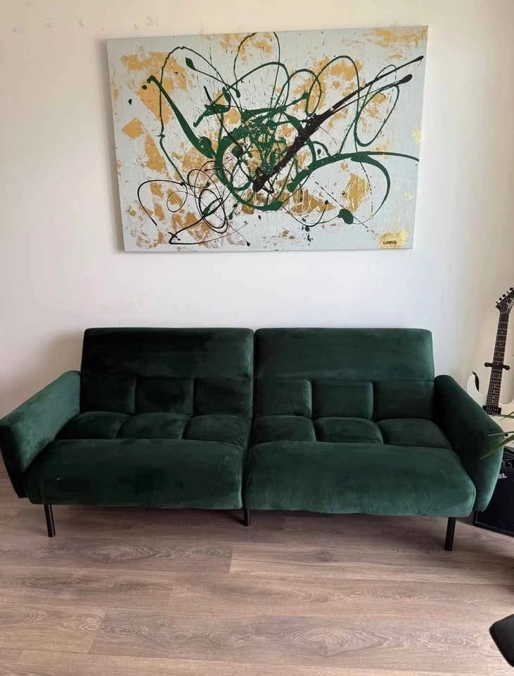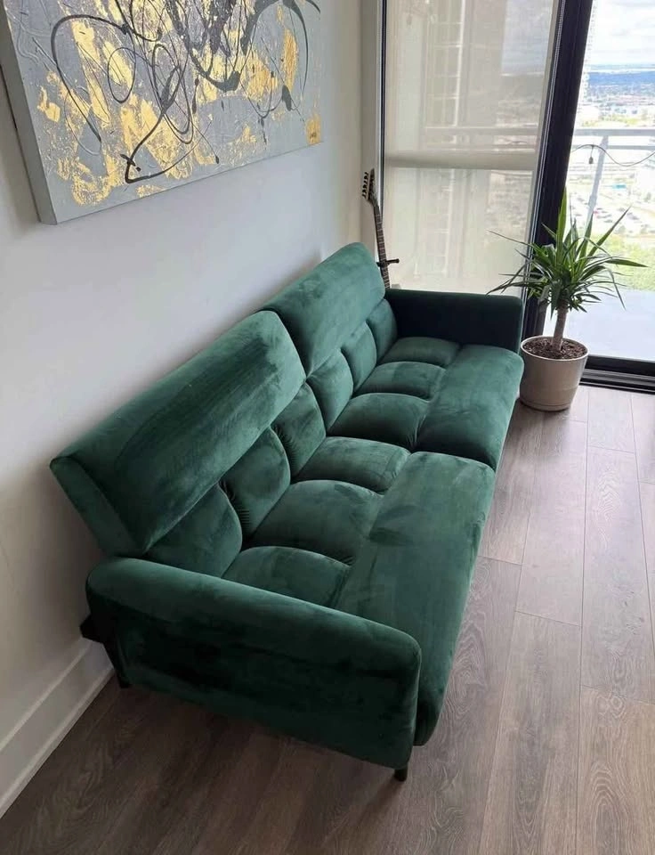 Selling a modern emerald green velvet sofa in excellent condition. Gently used, no damage. Perfect for a stylish living room or guest space. Comfortable seating and soft upholstery. Easily converts into a spacious bed. Elegant velvet fabric with sturdy black metal legs. Modern and practical design.