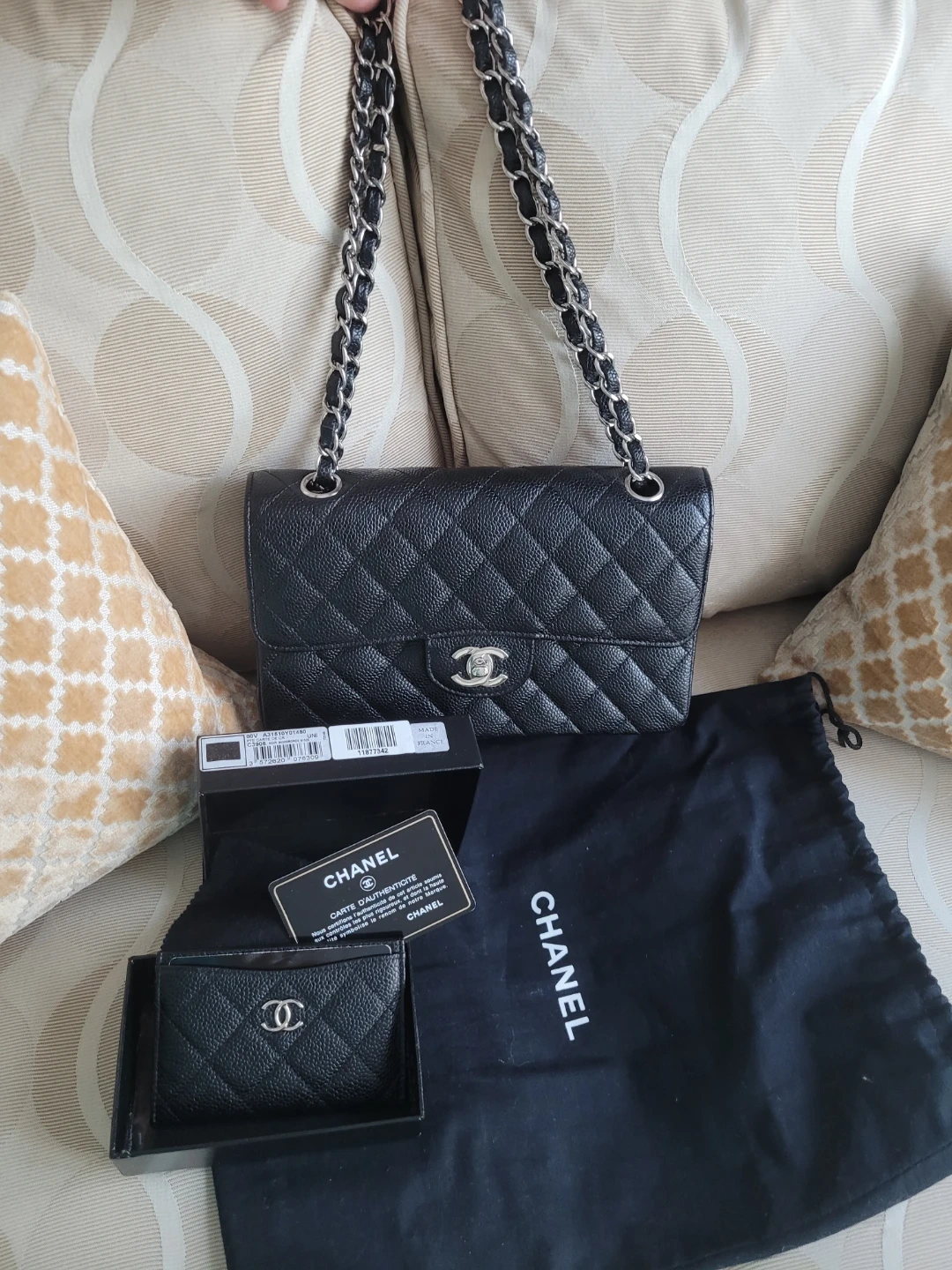100%Authentic CHANEL Small B Caviar Dbl Flap Bg+Card Case