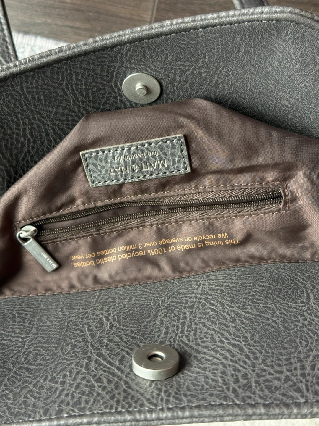This MAT & NAT tote bag is made from grey vegan leather. The interior lining is crafted from 100% recycled plastic bottles. It's a stylish and eco-conscious choice for everyday use!