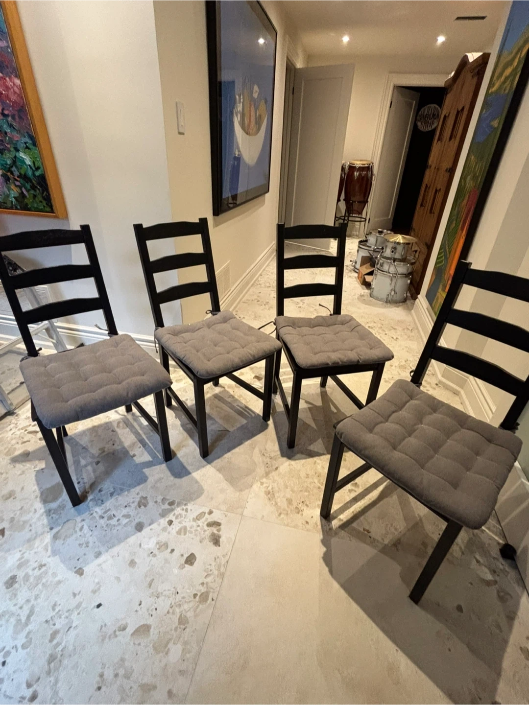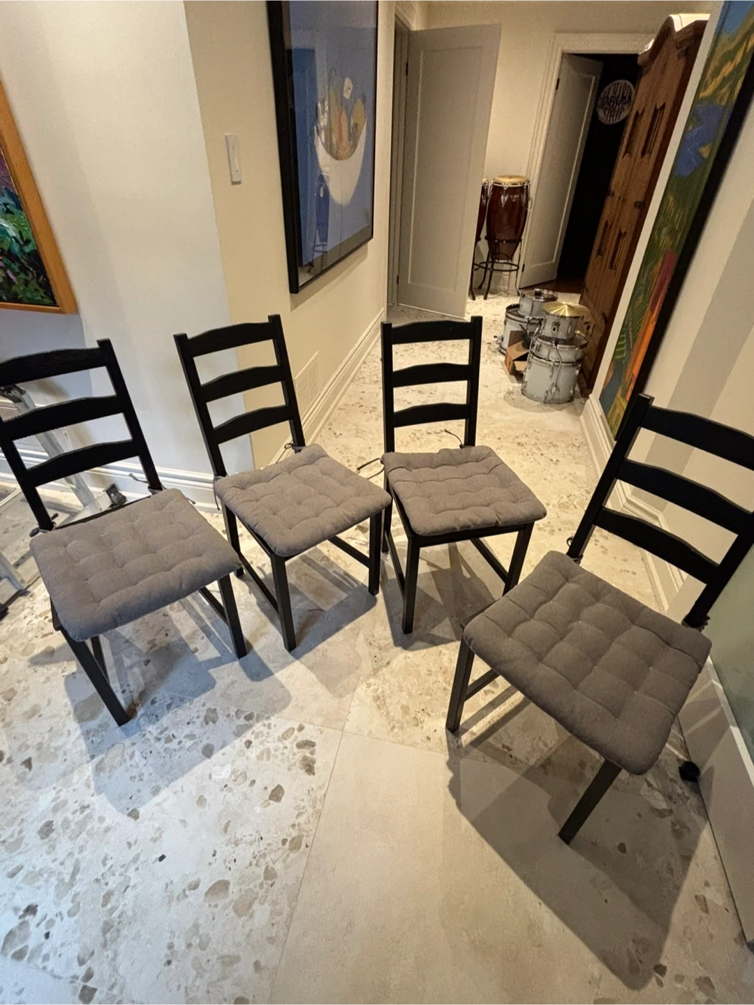 Selling a set of four black dining chairs, each with a grey upholstered cushion, suitable for a dining room or kitchen area. The chairs are being sold in a set with a dining table of the same colour (not pictured as it has been taken apart for the convenience of the buyer). Each chair was originally $100 and the table was $300, great deal!