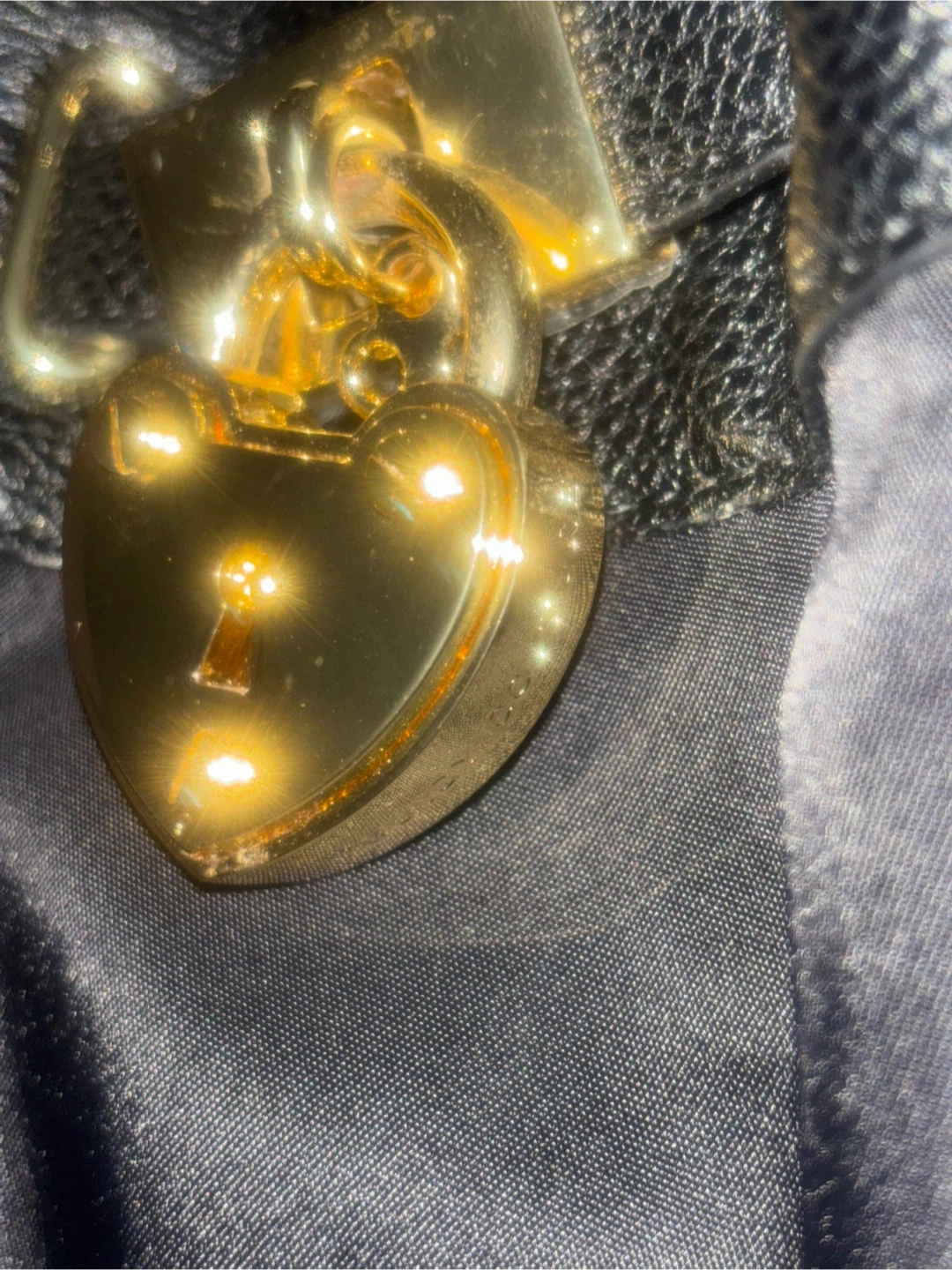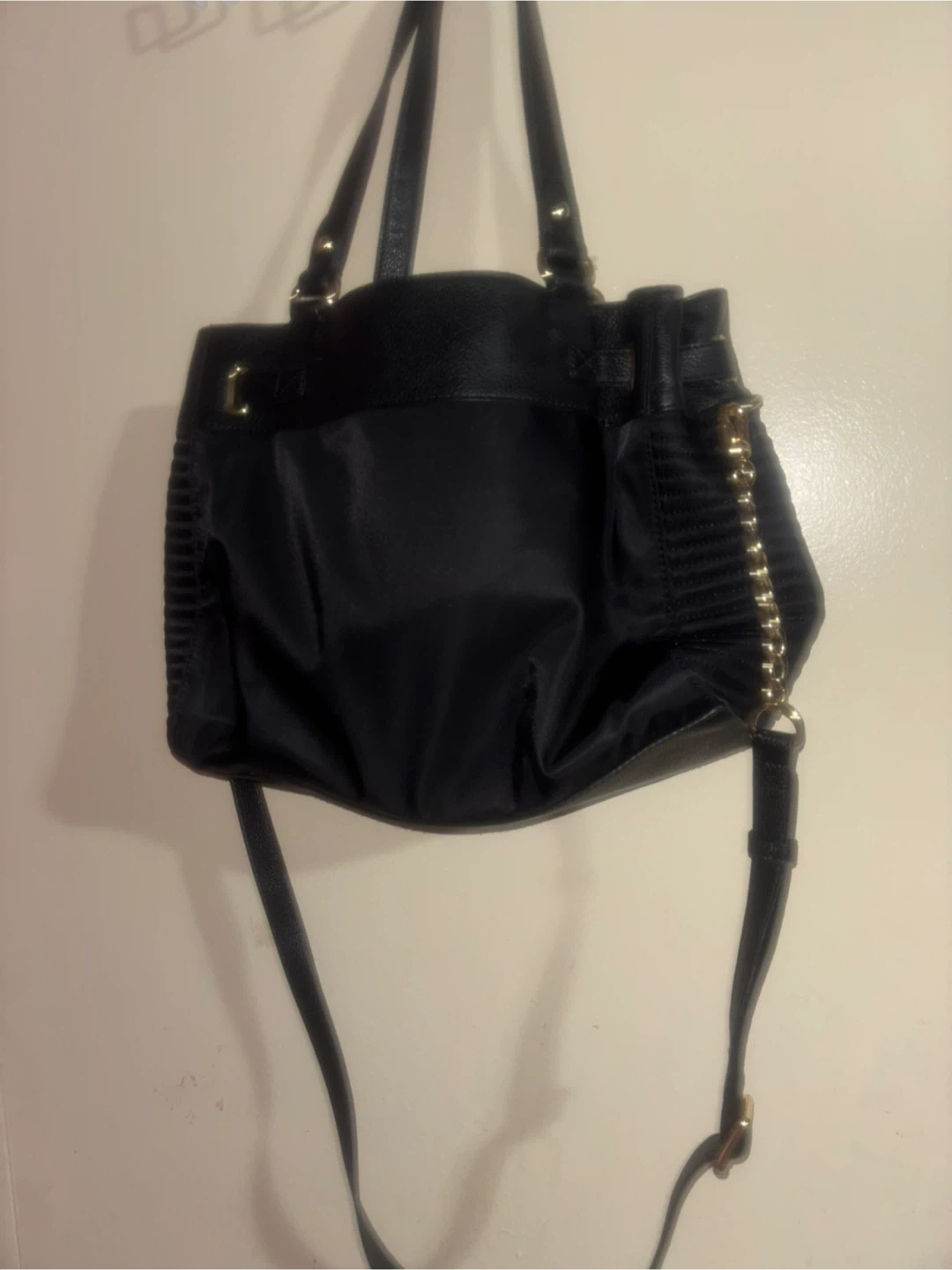 This Juicy Couture satchel bag is black with gold hardware accents. It's made from a mix of pebbled leather and fabric. This versatile bag comes with both top handles and a detachable shoulder strap.