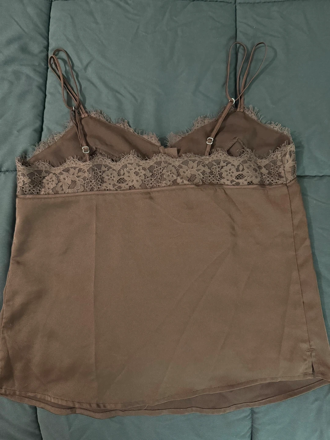This is a stylish brown camisole made from a satin-like material. It features delicate lace detailing along the neckline and adjustable spaghetti straps. Two small buttons are visible at the front.