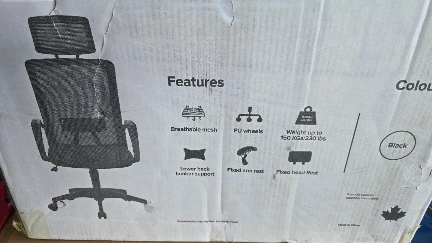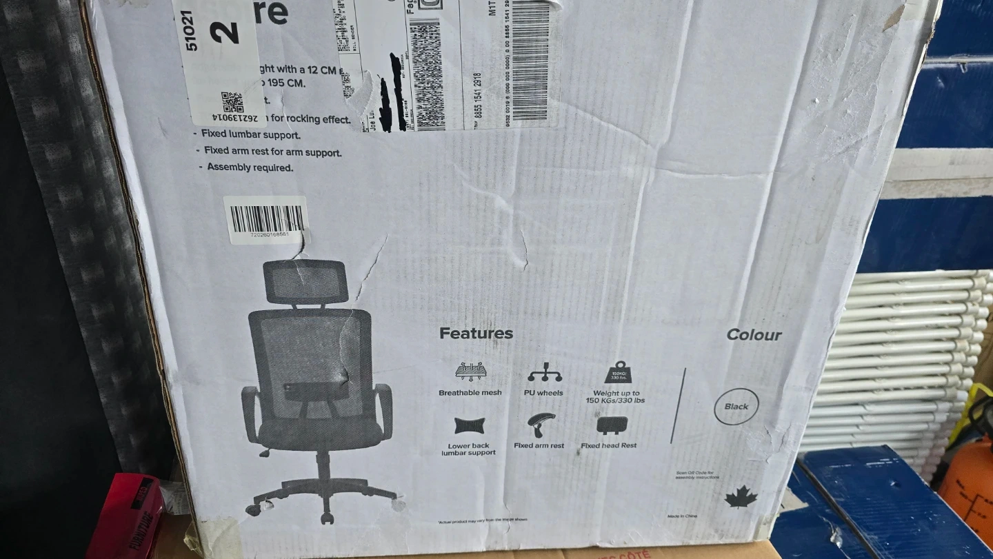 Selling a black mesh office chair! It has a breathable mesh back, PU wheels, lower back lumbar support, fixed arm rests, and a fixed head rest. It can hold up to 150 kg/330 lbs. BRAND NEW IN BOX.
