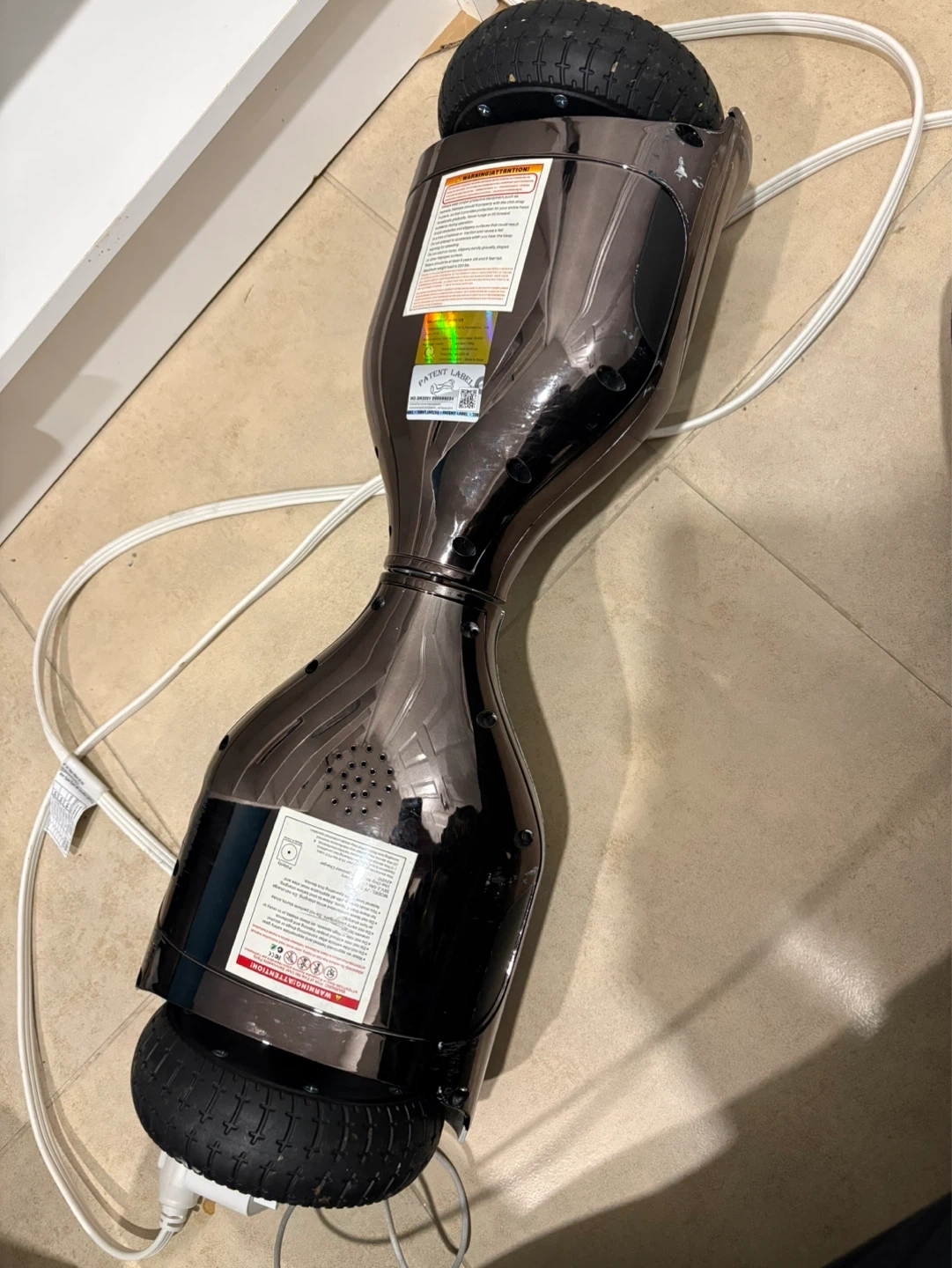 This is a chrome-finished hoverboard with black wheels and accents. Good for parts and possibly battery replacement. Doesn’t really work anymore just trying to get ride of it.