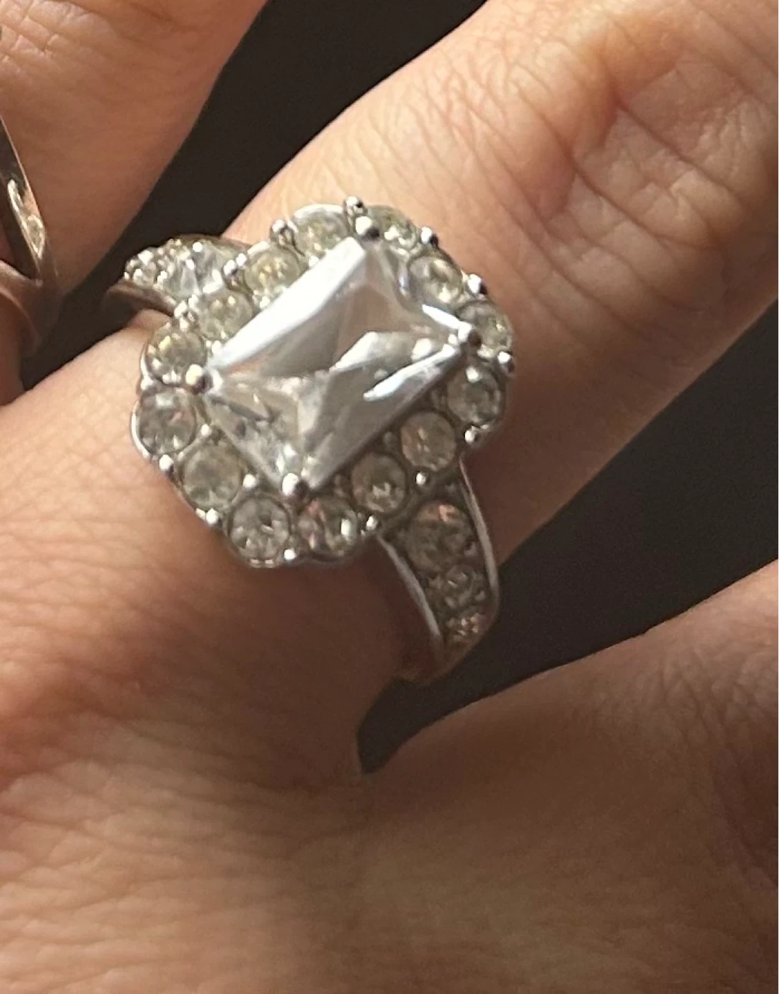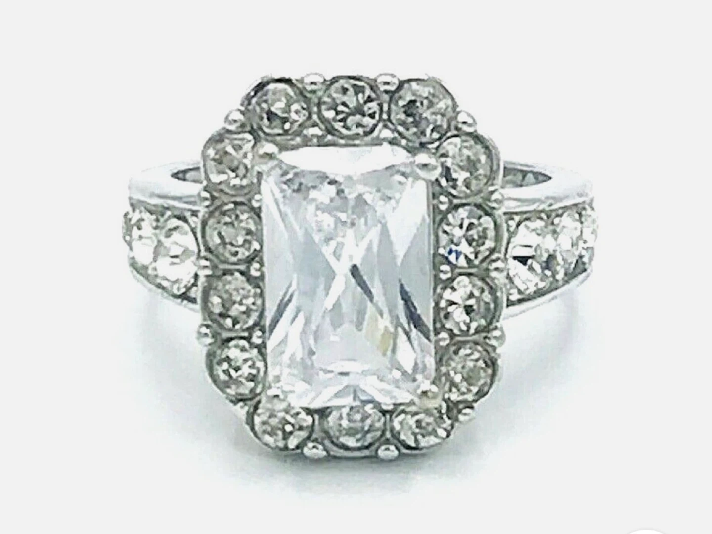 A dazzling ring featuring a large rectangular emerald stone surrounded by smaller stones. The band also has stone accents. Adds sparkle to any outfit!
