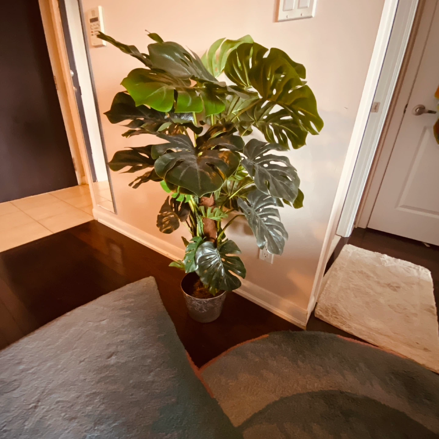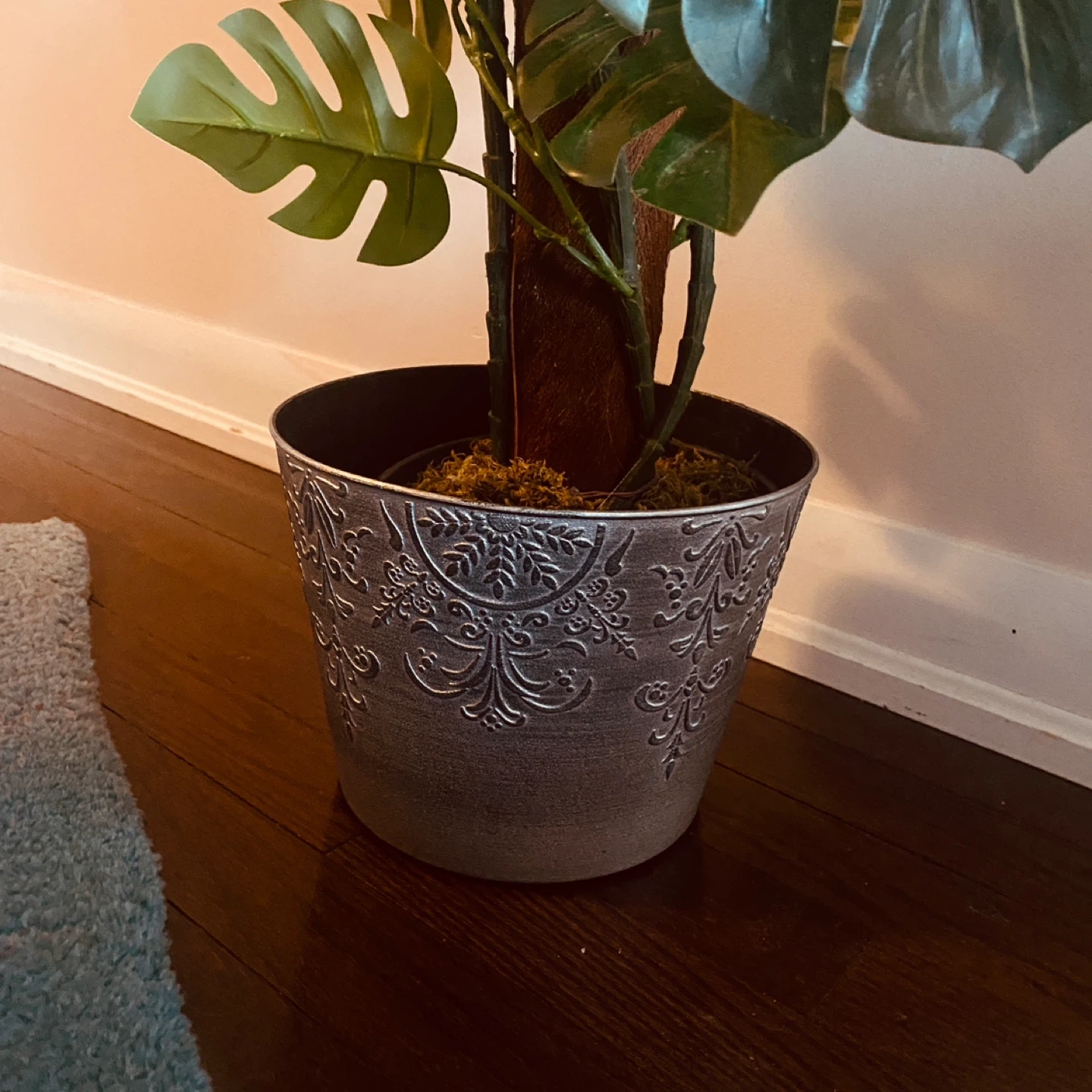 It's a faux Monstera plant with lush green leaves. Comes in a decorative silver pot with an embossed pattern. This plant adds a touch of greenery to any room without needing care!