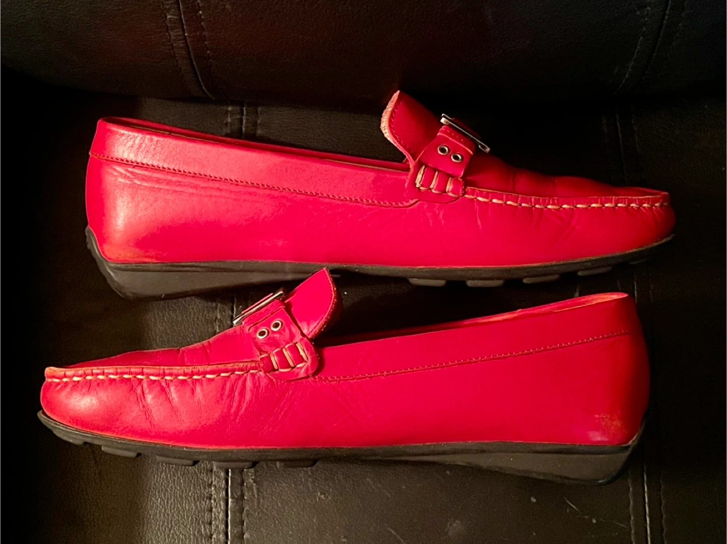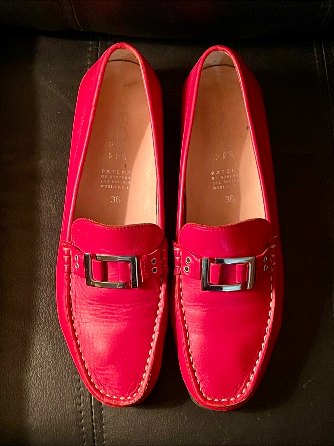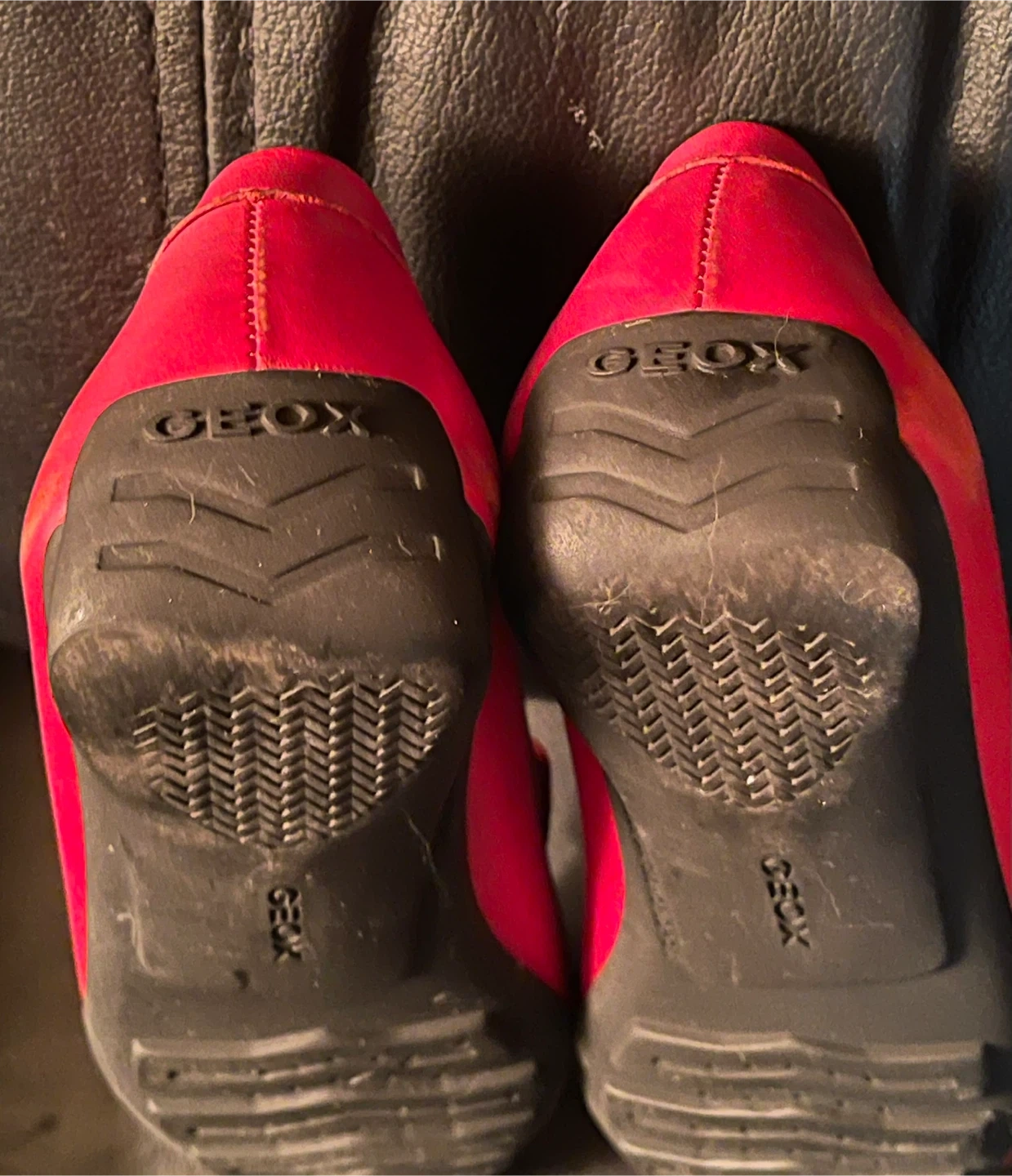 These are Geox Respira red leather loafers with rubber soles. They're a size 36. Perfect for everyday wear! Made by an Italian company known for high-quality comfortable shoes. Made in Morocco. Excellent condition with minimal signs of wear.