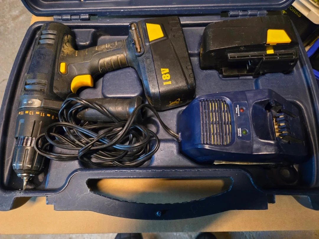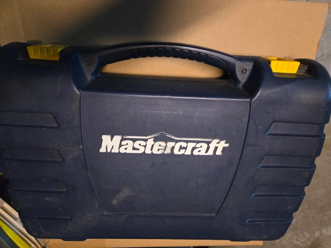 Selling a Mastercraft 18V, variable speed cordless drill with 2 battery packs and charger, keyless chuck, 24 position adjustable clutch, forward/reverse trigger lock button, auxiliary handle and bubble level.