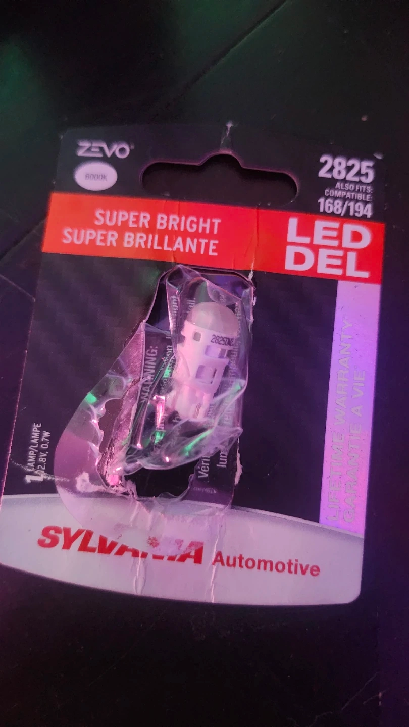 This is a Zevo 2825 LED bulb with a super bright 6000K colour temperature. It's also compatible with 168 and 194 bulbs. This lamp uses 2.8V and 0.7W.