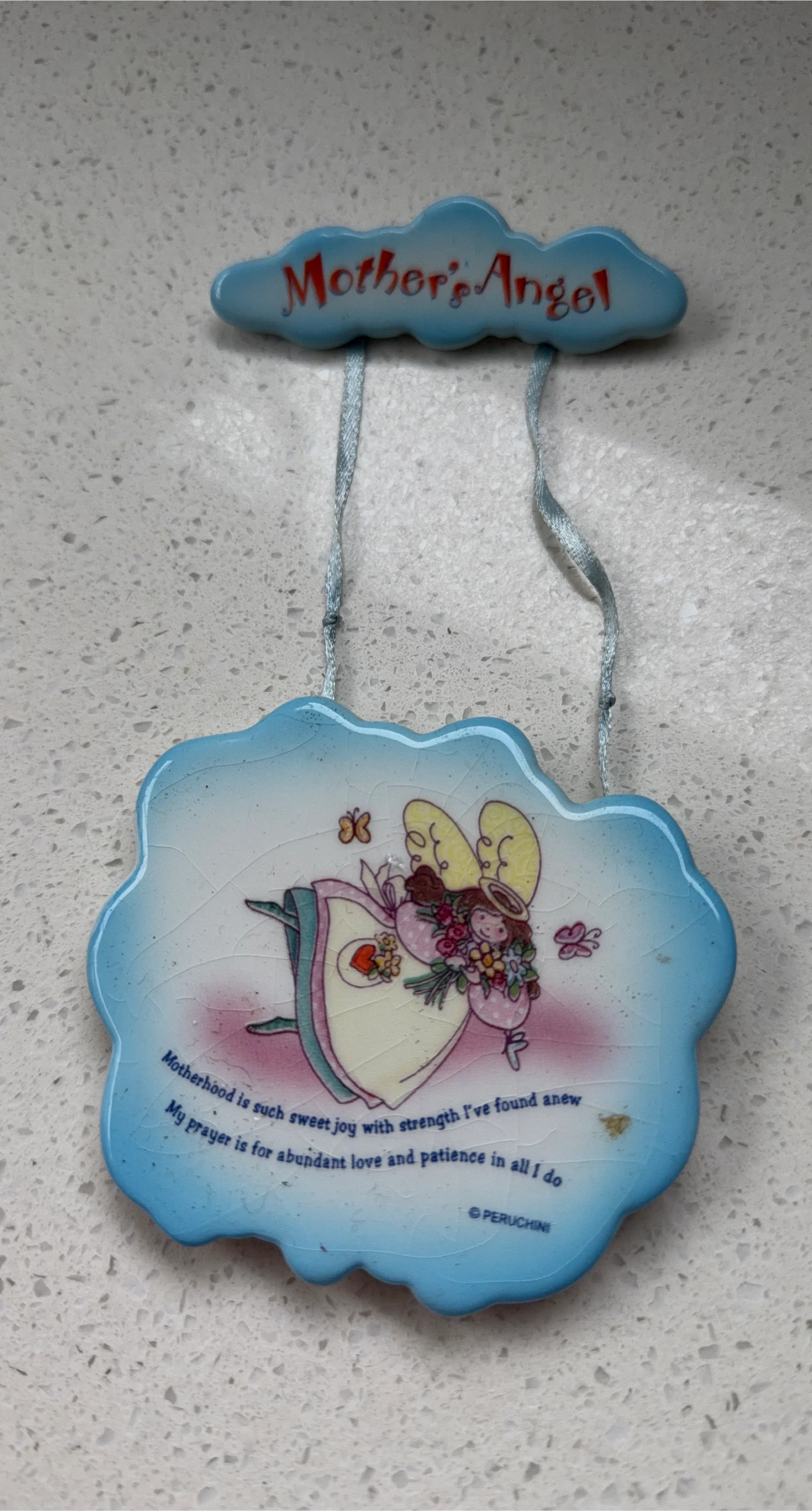 Michel Company Mother Angel ornament. Reads "Motherhood is such sweet joy with strength I've found anew. My prayer is for abundant love and patience in all I do." Made in China.