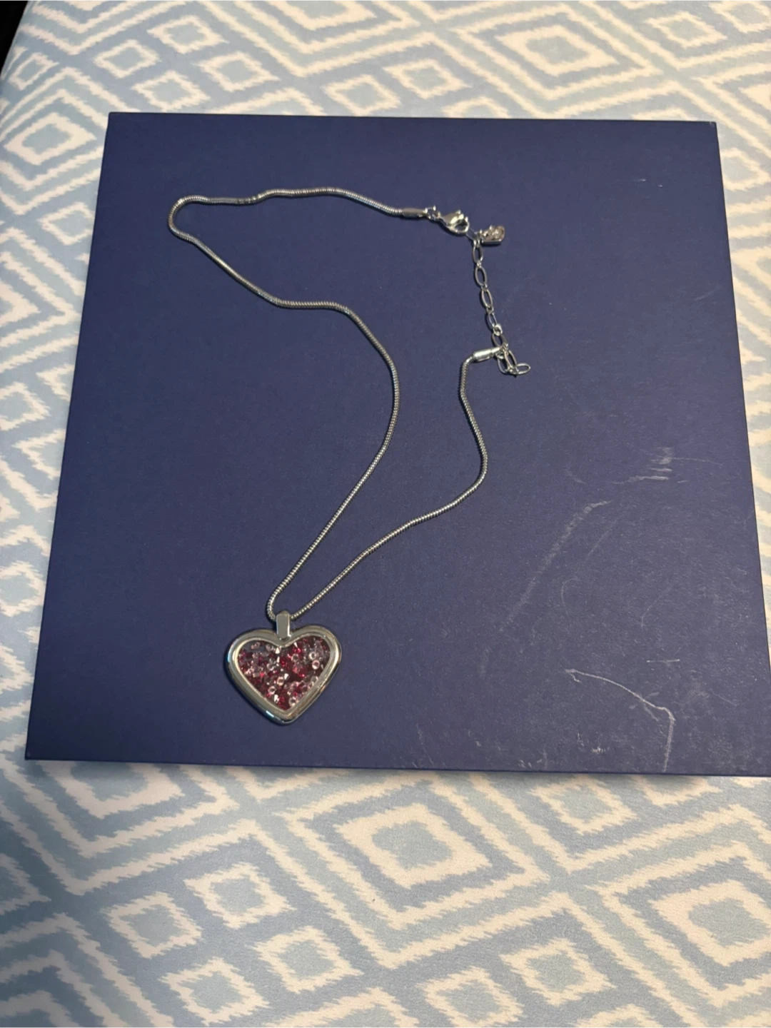 Beautiful Swarovski necklace featuring a silver-toned chain and a heart-shaped pendant filled with pink crystals. The chain has an adjustable clasp for a custom fit. It's a lovely accessory for adding a touch of sparkle!