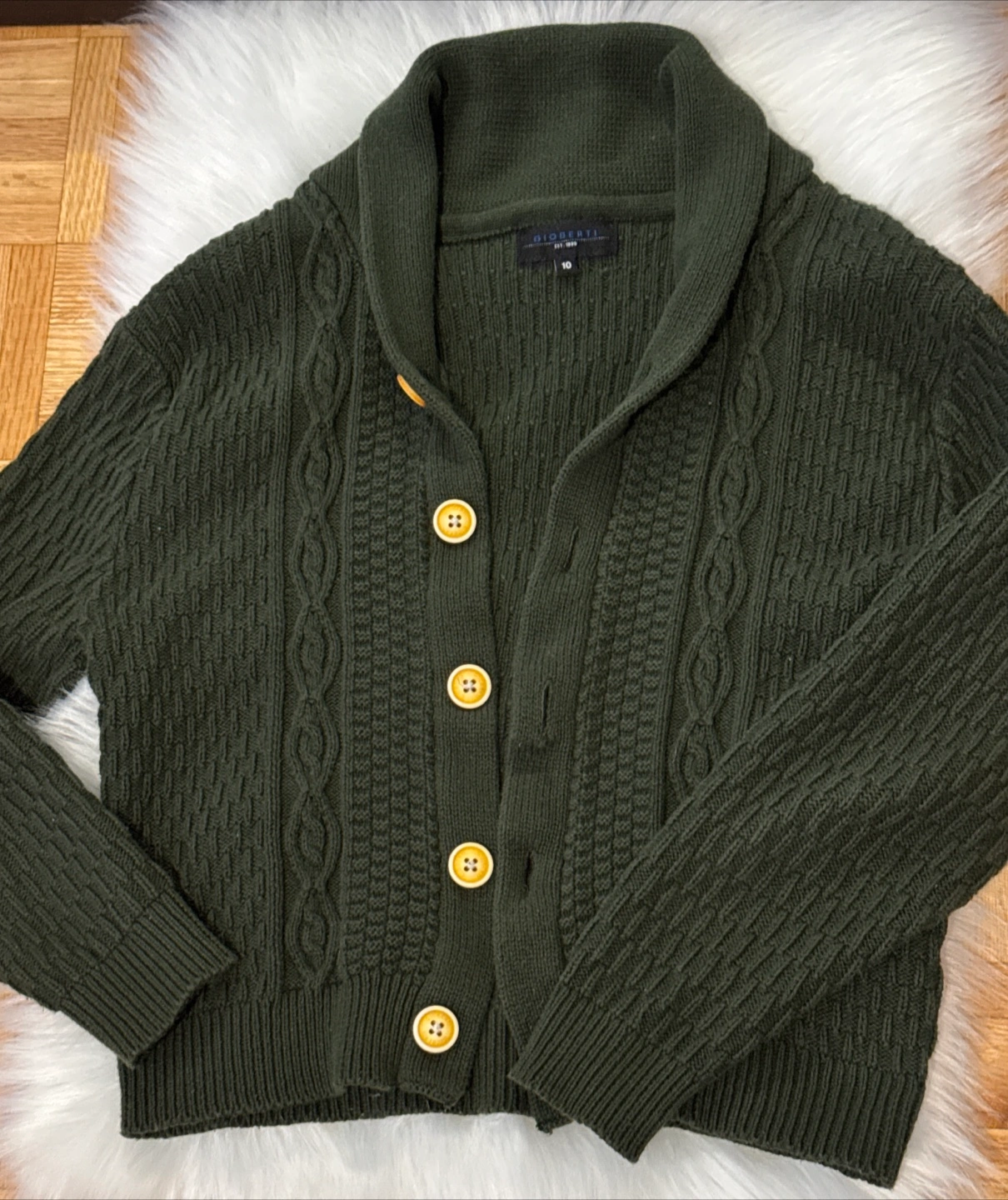 Here's a lovely Gioberti cardigan in a beautiful green colour! It features a classic cable knit design and wooden-look buttons, perfect for layering on those cooler days