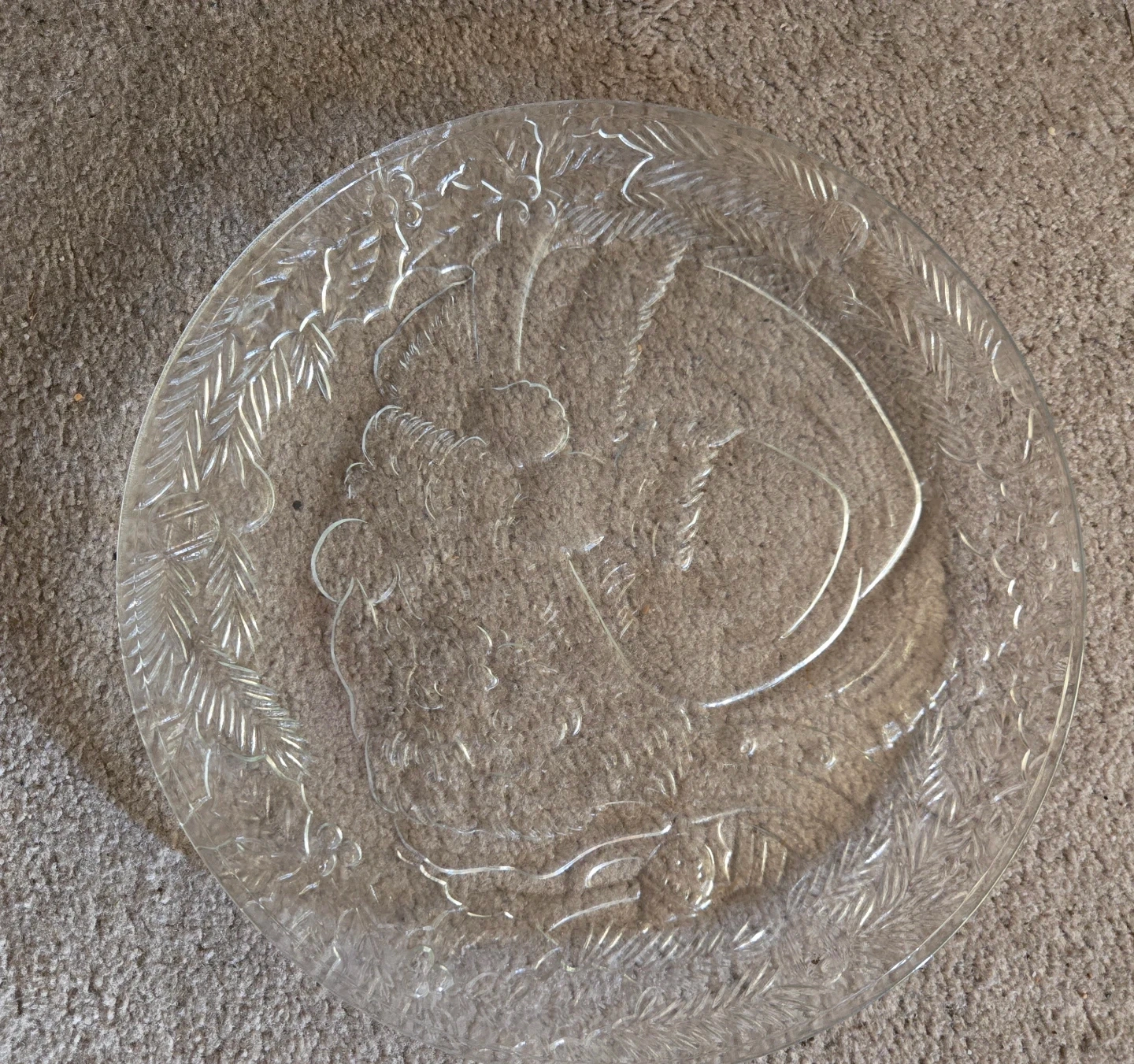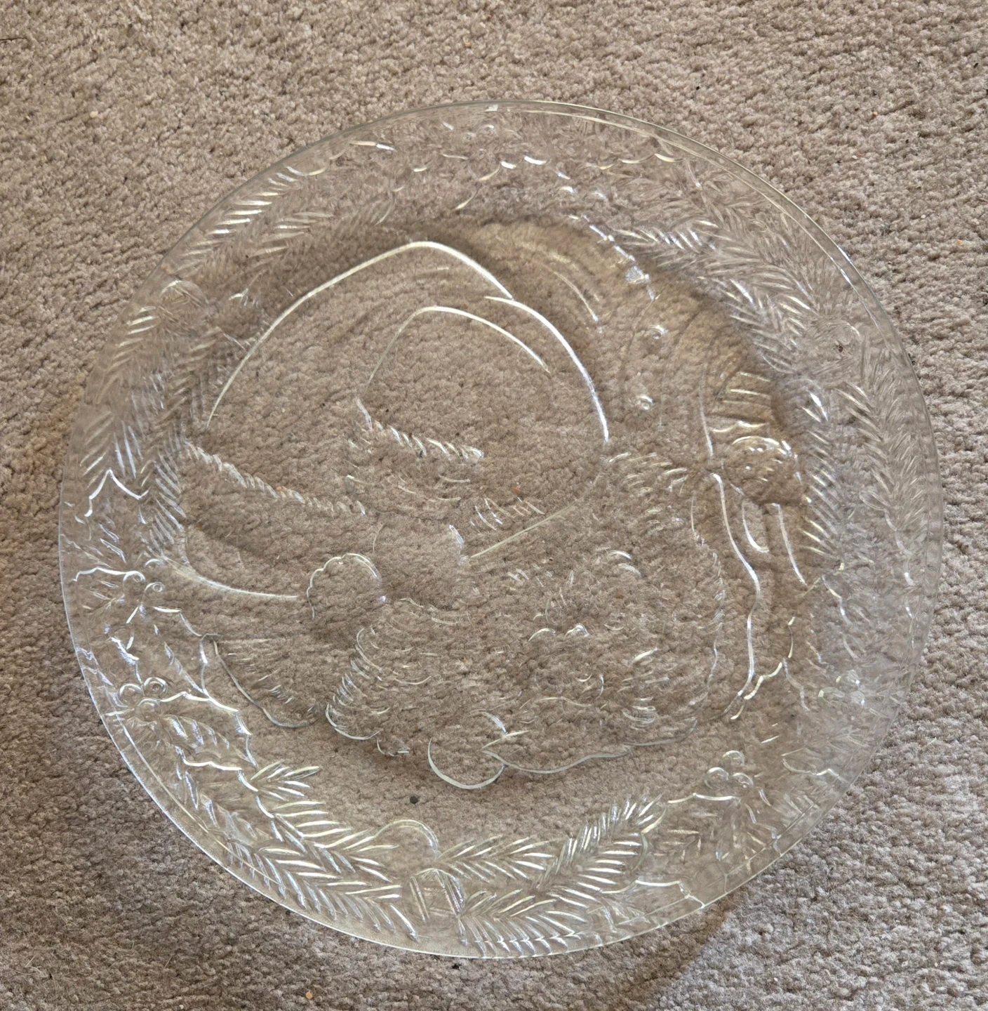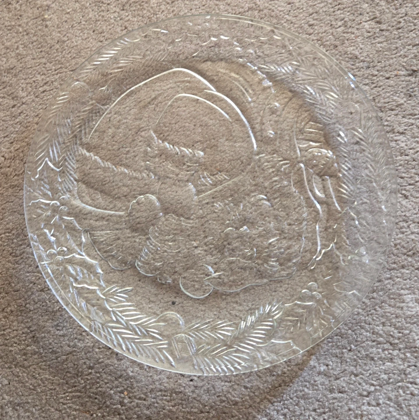 Clear glass platter with an embossed Santa Claus design. Measures 13 inches or 33 cm in diameter. Perfect for holiday serving!