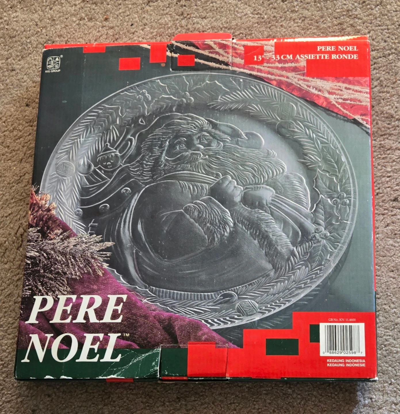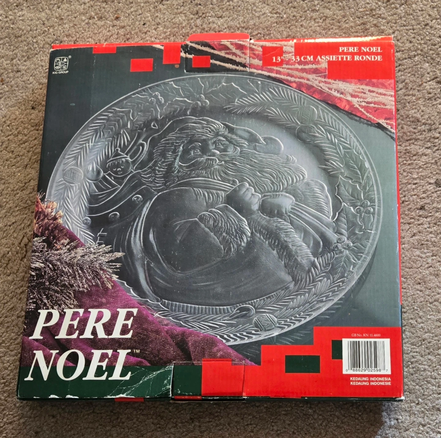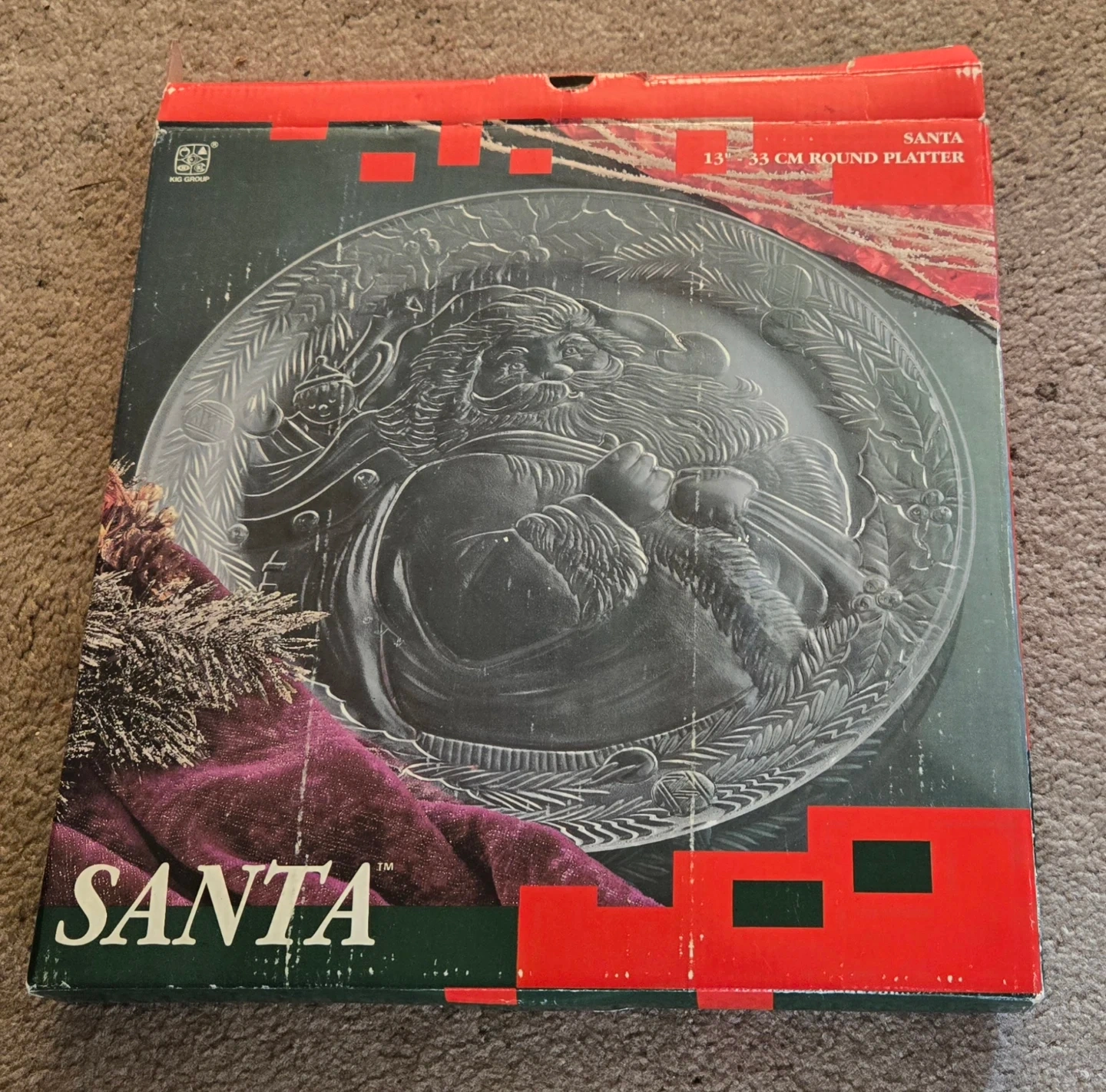 Clear glass platter with an embossed Santa Claus design. Measures 13 inches or 33 cm in diameter. Perfect for holiday serving!