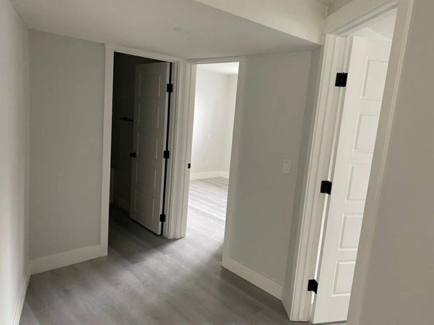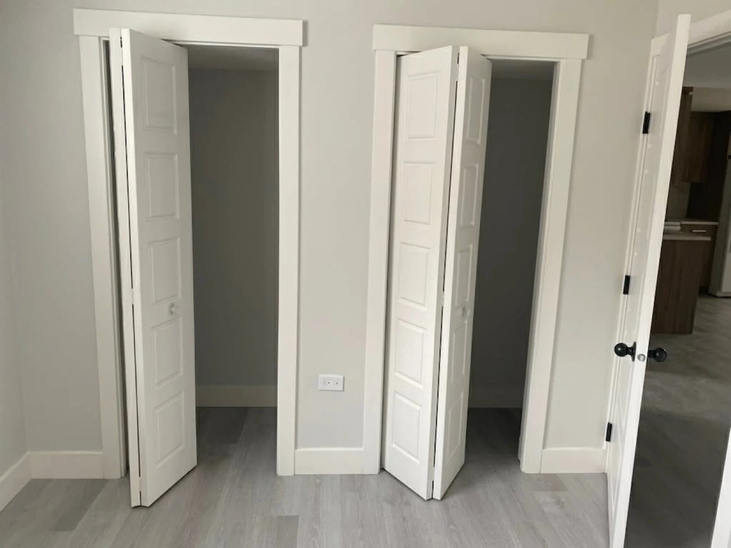 This is a clean, neutral bedroom space with modern wood-look laminate flooring. It features a double-door closet with mirrored sliding doors. A window provides natural light. Ready for your personal rent included utilities