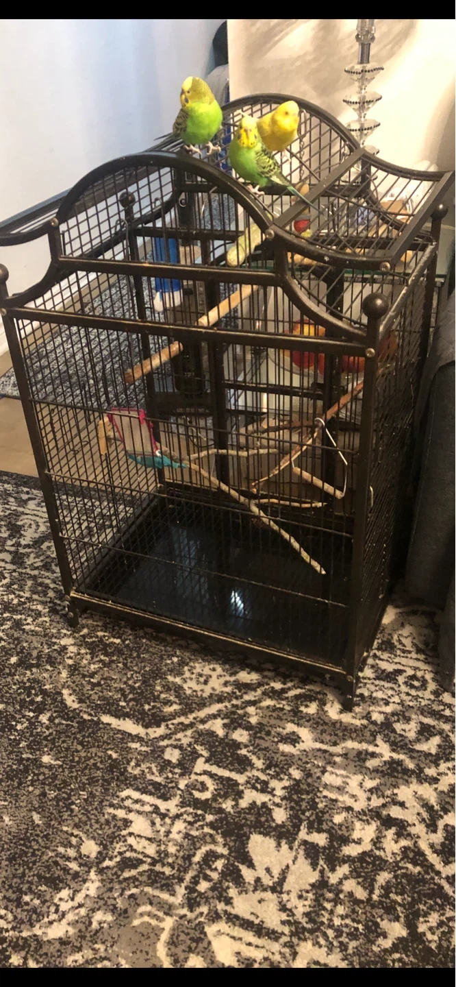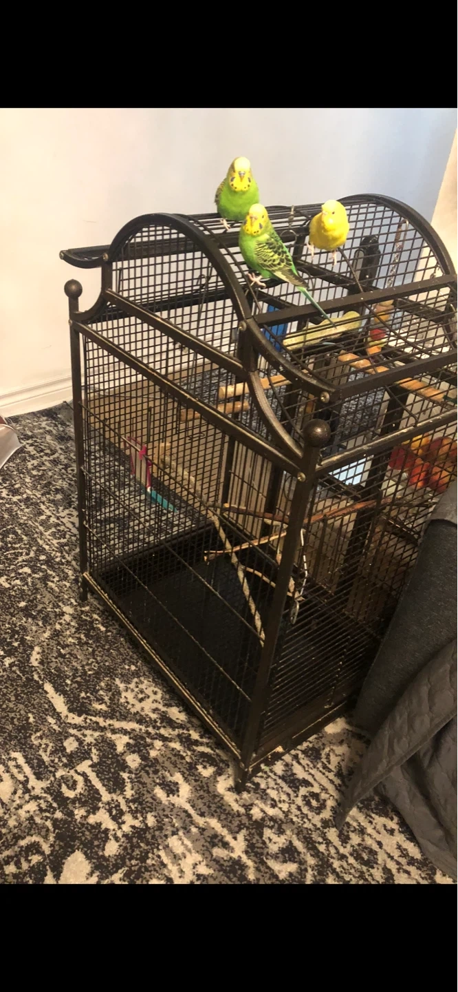 This is a stylish black wrought iron bird cage. It has multiple perches inside and a decorative top. It's a good size for smaller birds like parakeets or finches.