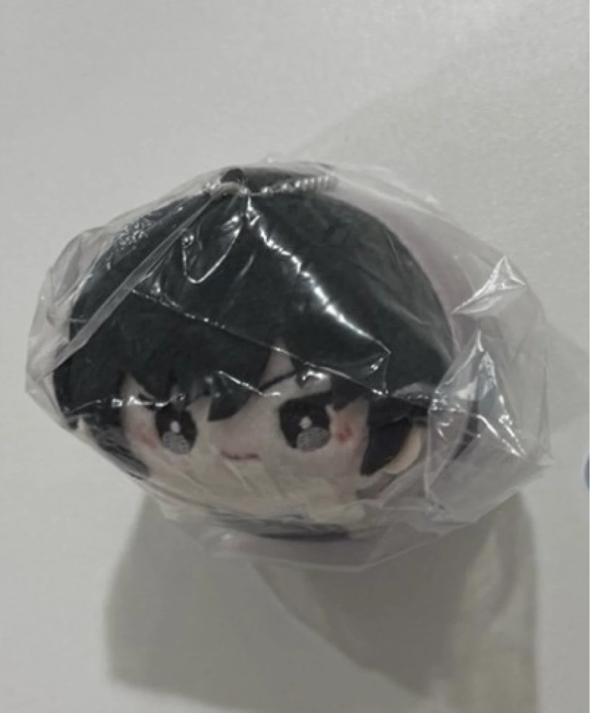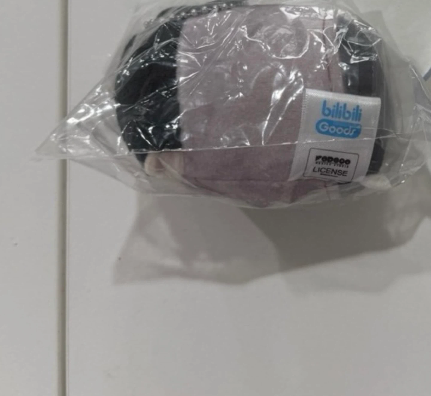 This is a plush keychain from Bilibili Goods. It features a character design with black hair and a purple/grey body. The keychain is still in its original packaging.