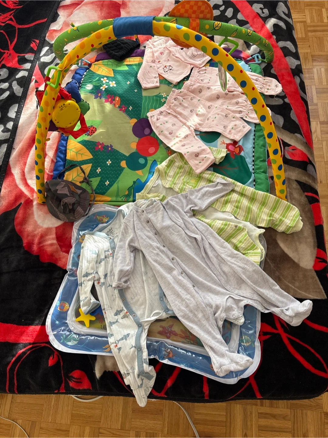 This bundle includes a colourful baby play mat with arches and several baby sleepers. The sleepers are in various patterns and colours, including pink with animal prints and grey with stripes. It's perfect for tummy time and keeping your little one comfy!