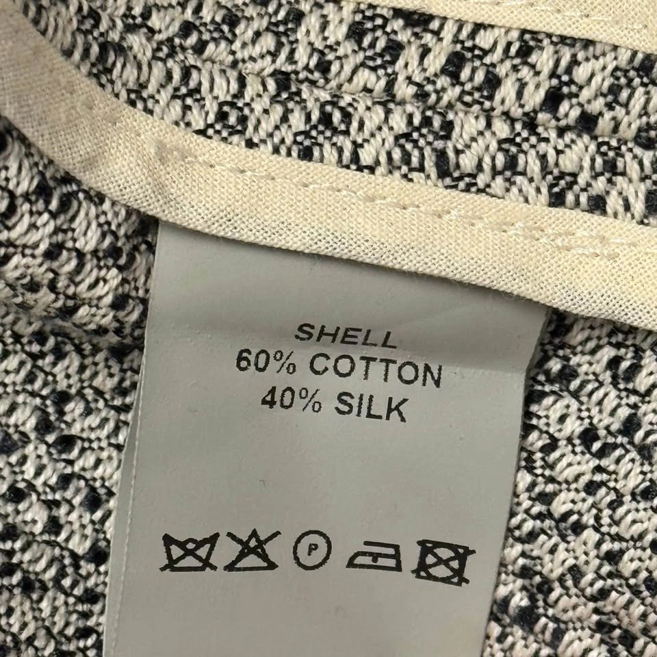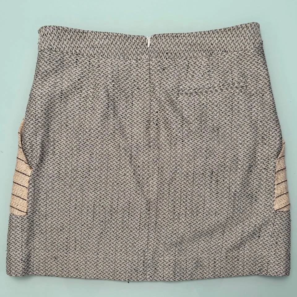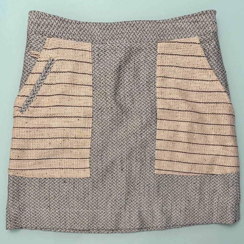 This stunning Billy Reid mini skirt is a masterclass in "Quiet Luxury." Made in Italy from a luxurious 60% Cotton and 40% Silk blend, it features a sophisticated textured weave that offers both structure and a soft, premium hand-feel. It has a neutral gray and charcoal micro-textured body contrasted with beautiful beige striped patch pockets. The skirt has a classic A-line mini cut that sits comfortably at the waist, with a discrete back zip closure and high-quality interior binding. Perfect for a professional look or weekend brunch. Excellent pre-loved condition. No visible flaws, pulls, or stains.