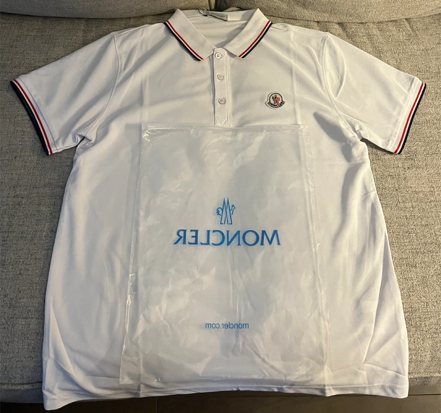 This is a white Moncler polo shirt. It features a classic collar with red and navy trim. The Moncler logo is embroidered on the chest.