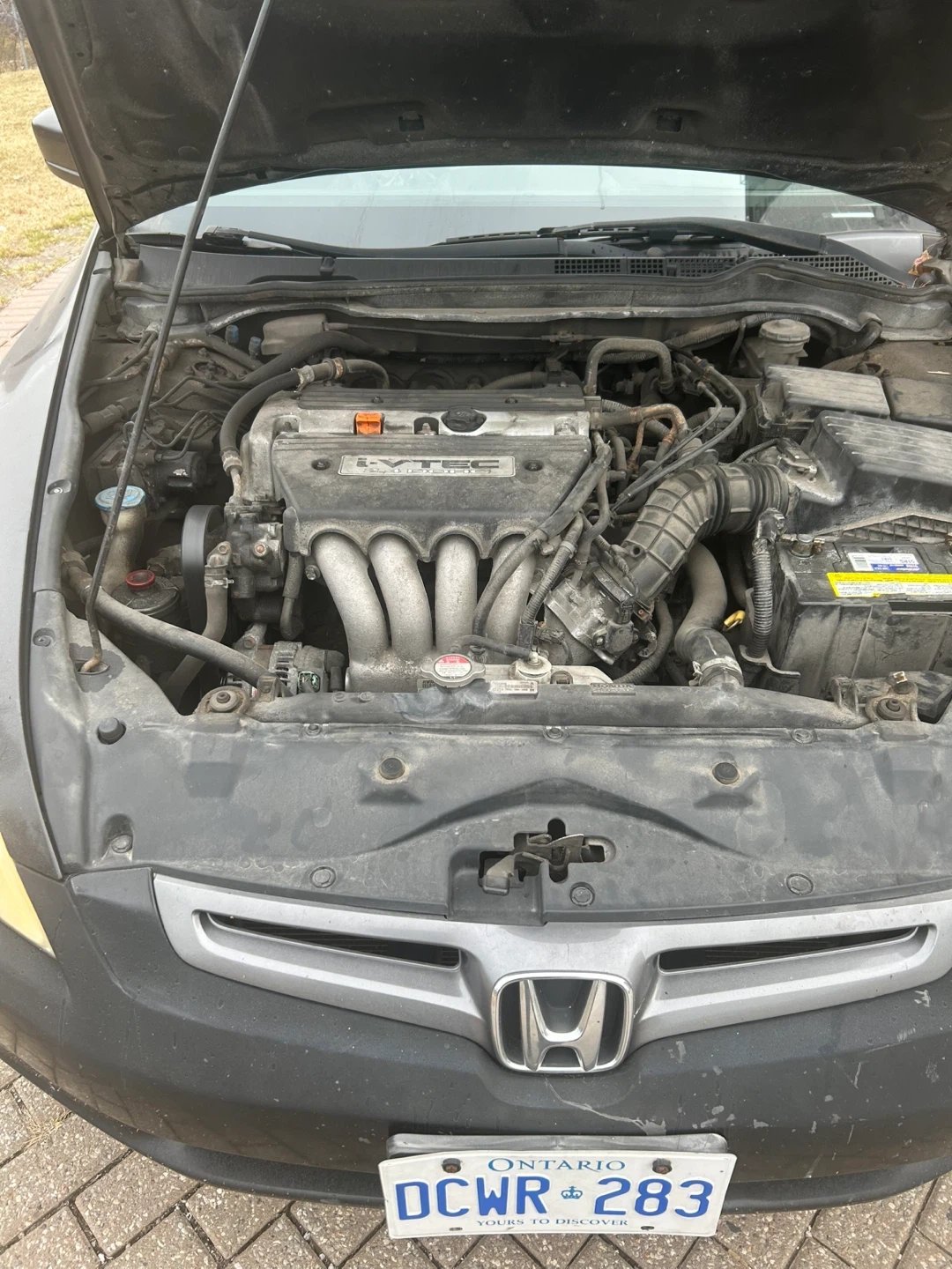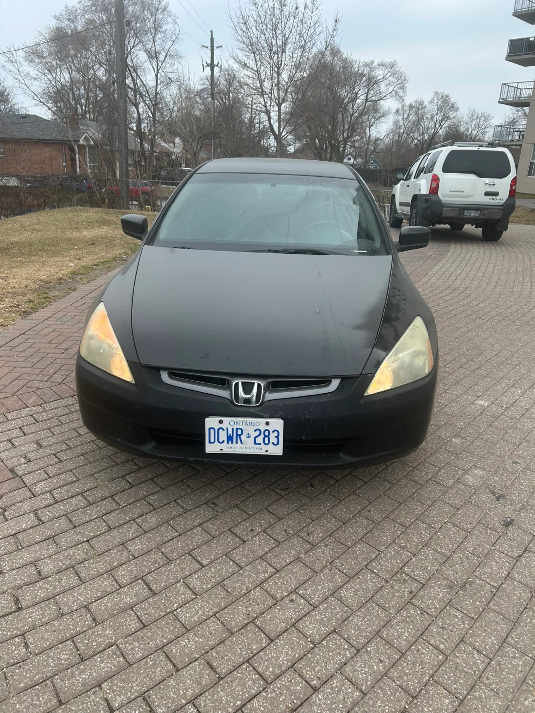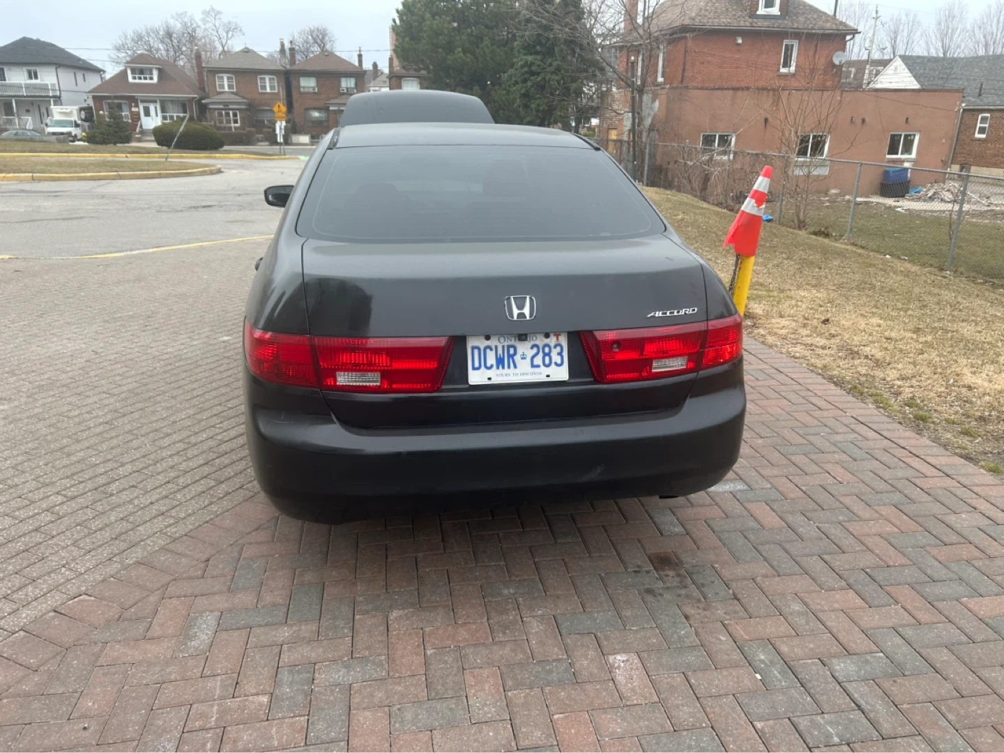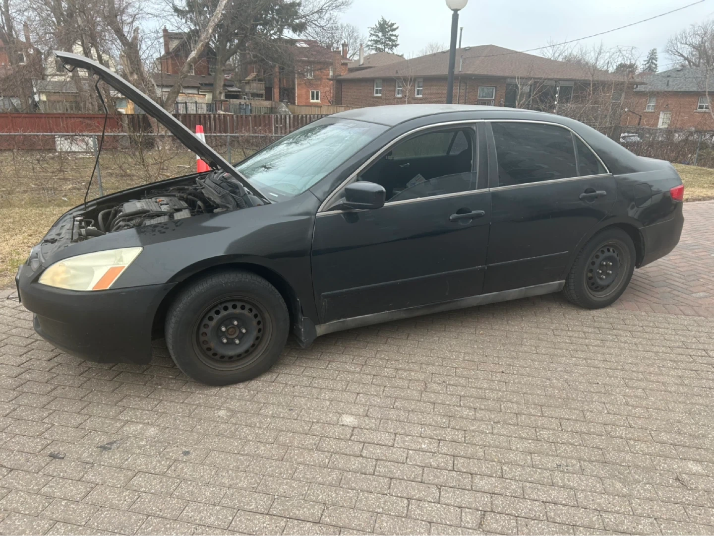 Black Honda Accord sedan. It's a four-door model with tinted windows and the hood is open. It needs to be certified but it runs all lights work as well as the a/c. It has 414 000 kms on it. It starts on one go also the transmission is good.