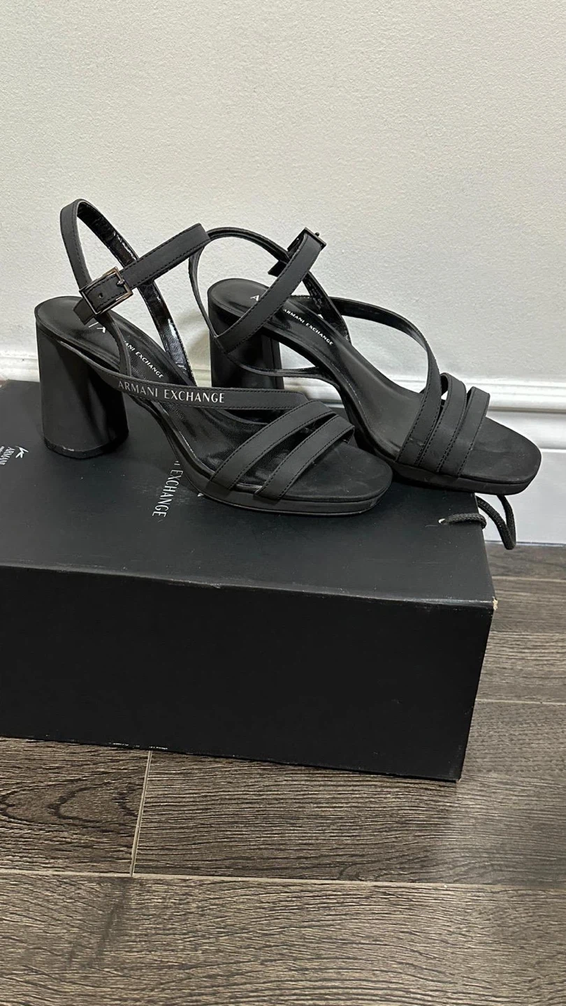 Black heeled sandals from Armani Exchange. Features a chunky heel and ankle strap. Comes with original box. Perfect for dressing up an outfit!
