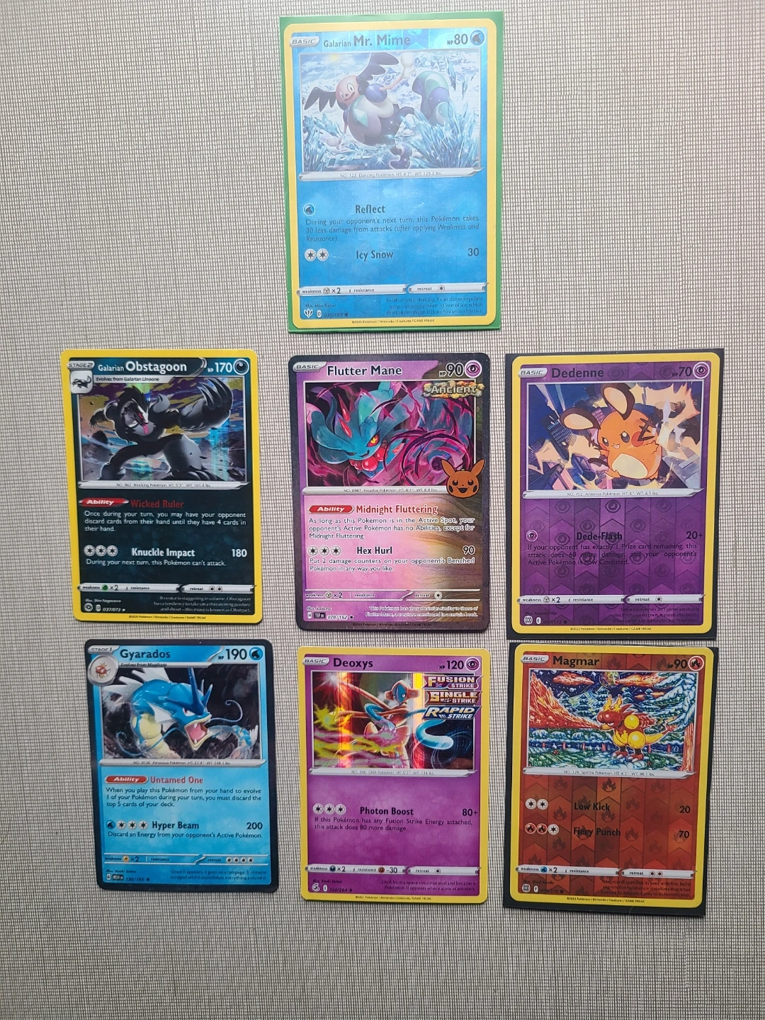 This listing includes several Pokémon trading cards. Features include Galarian Mr. Mime, Galarian Obstagoon, Flutter Mane, Dedenne, Gyarados, Deoxys, and Magmar. Collectible cards for fans of the Pokémon franchise. All shinys