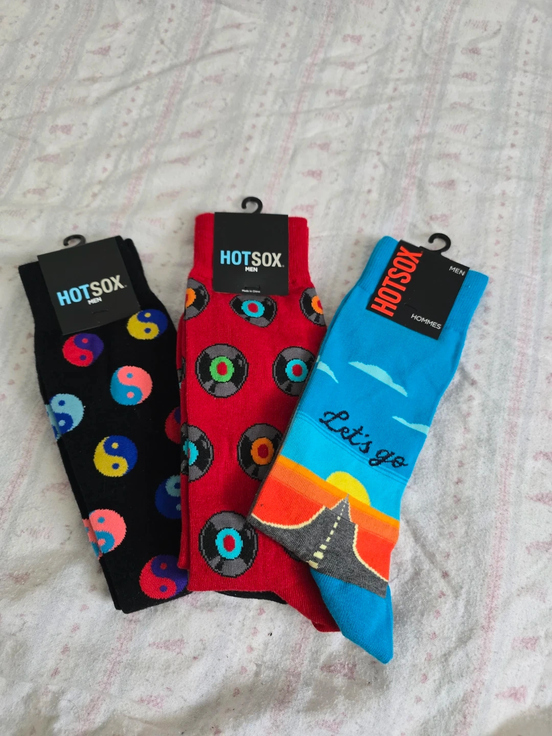 Three pairs of HOTSOX men's novelty socks. Includes designs with yin and yang symbols, vinyl records, and a scenic road trip graphic with 'Let's go' text. Gift/give to your favorite person.