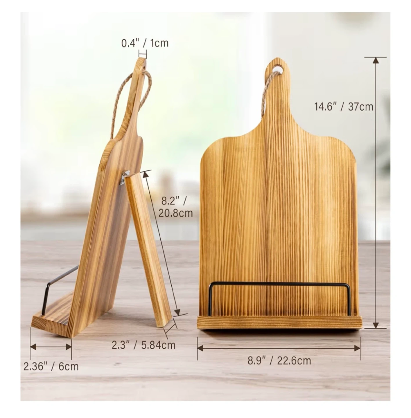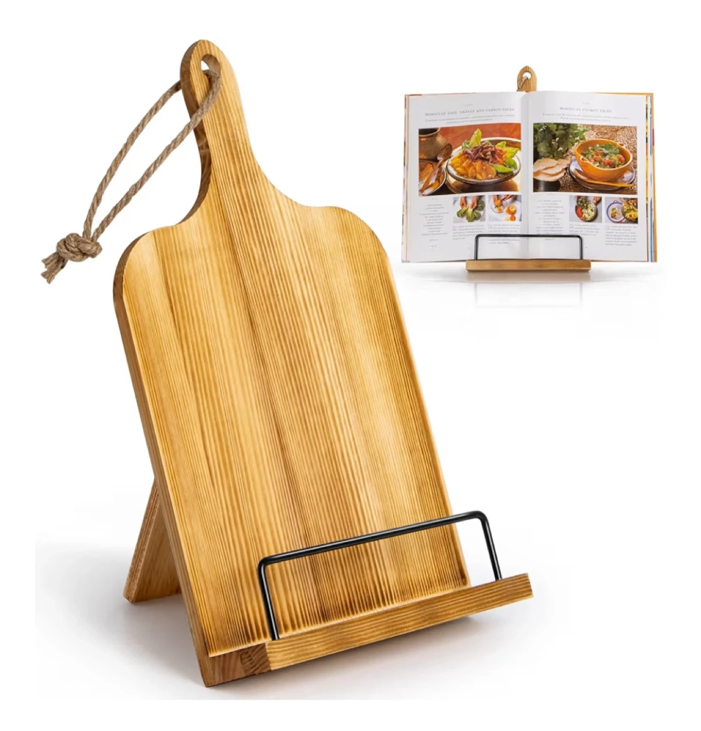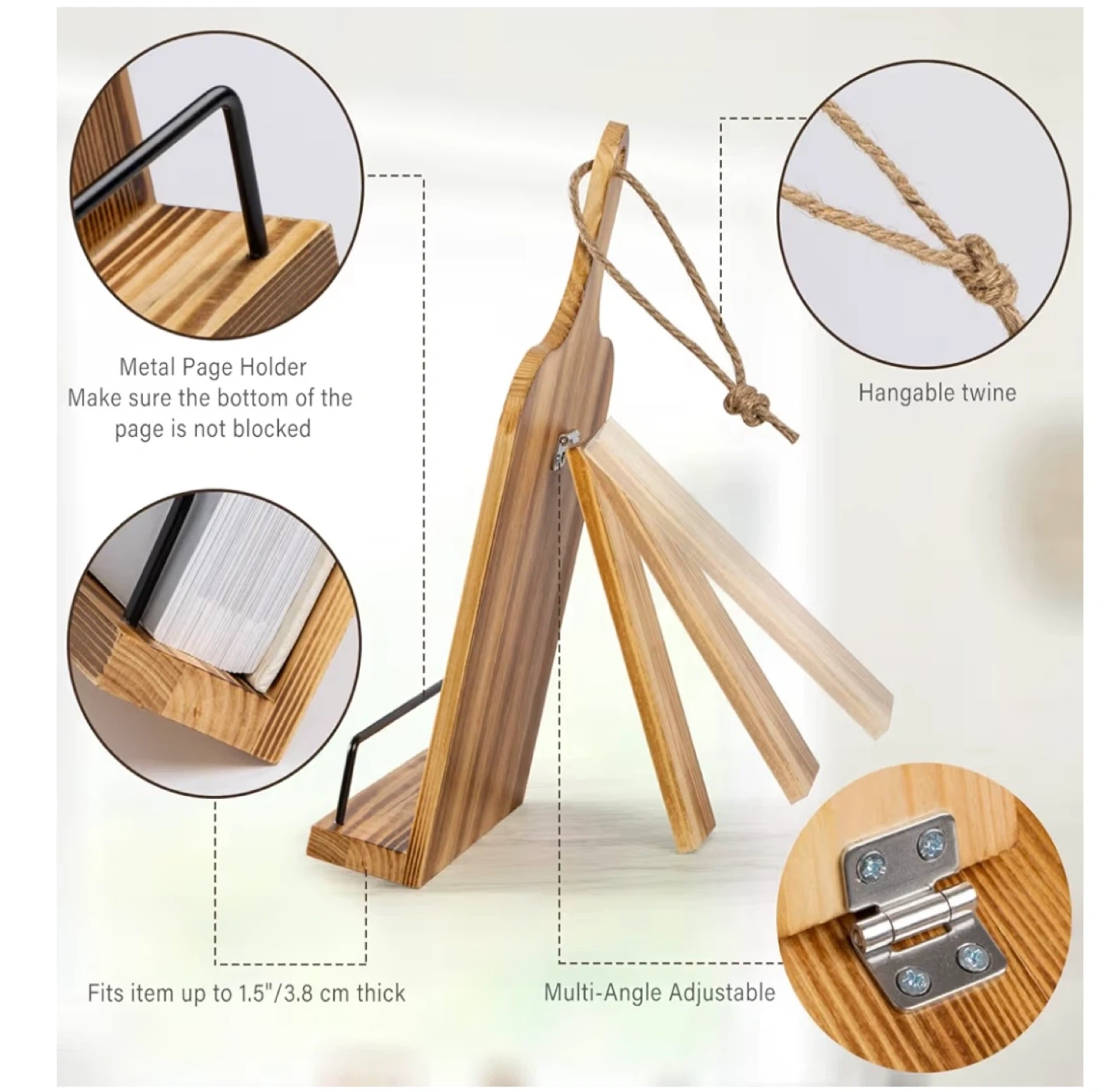 Brand new! This wooden recipe book stand features a metal page holder and adjustable multi-angles for comfortable viewing. It's designed to fit items up to 1.5"/3.8 cm thick. Hangable twine is included for easy storage.