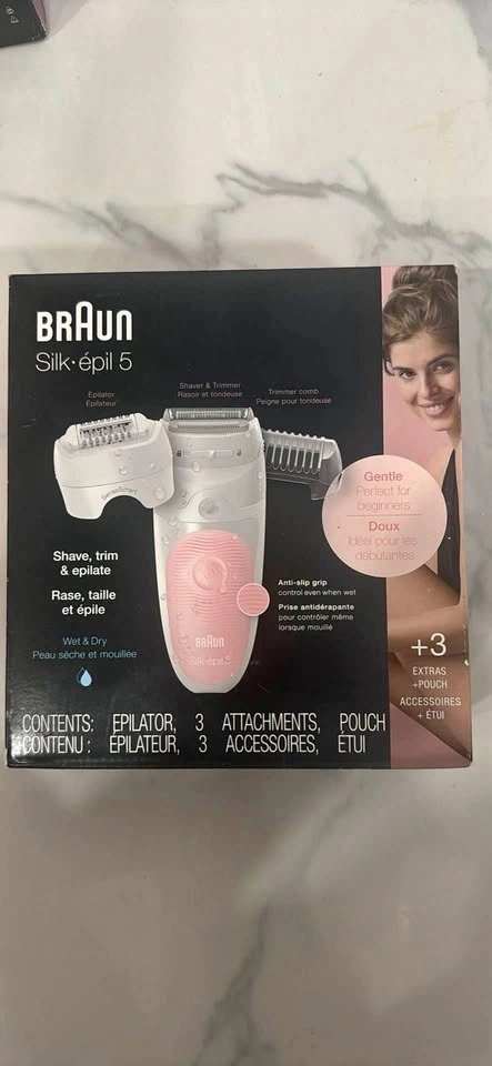 New Braun Silk-épil 5 epilator. Wet & Dry use, so you can use it in the shower. Has 3 attachments for shaving, trimming, and epilating. Comes with a pouch. Gentle and perfect for beginners. Anti-slip grip for easy handling.