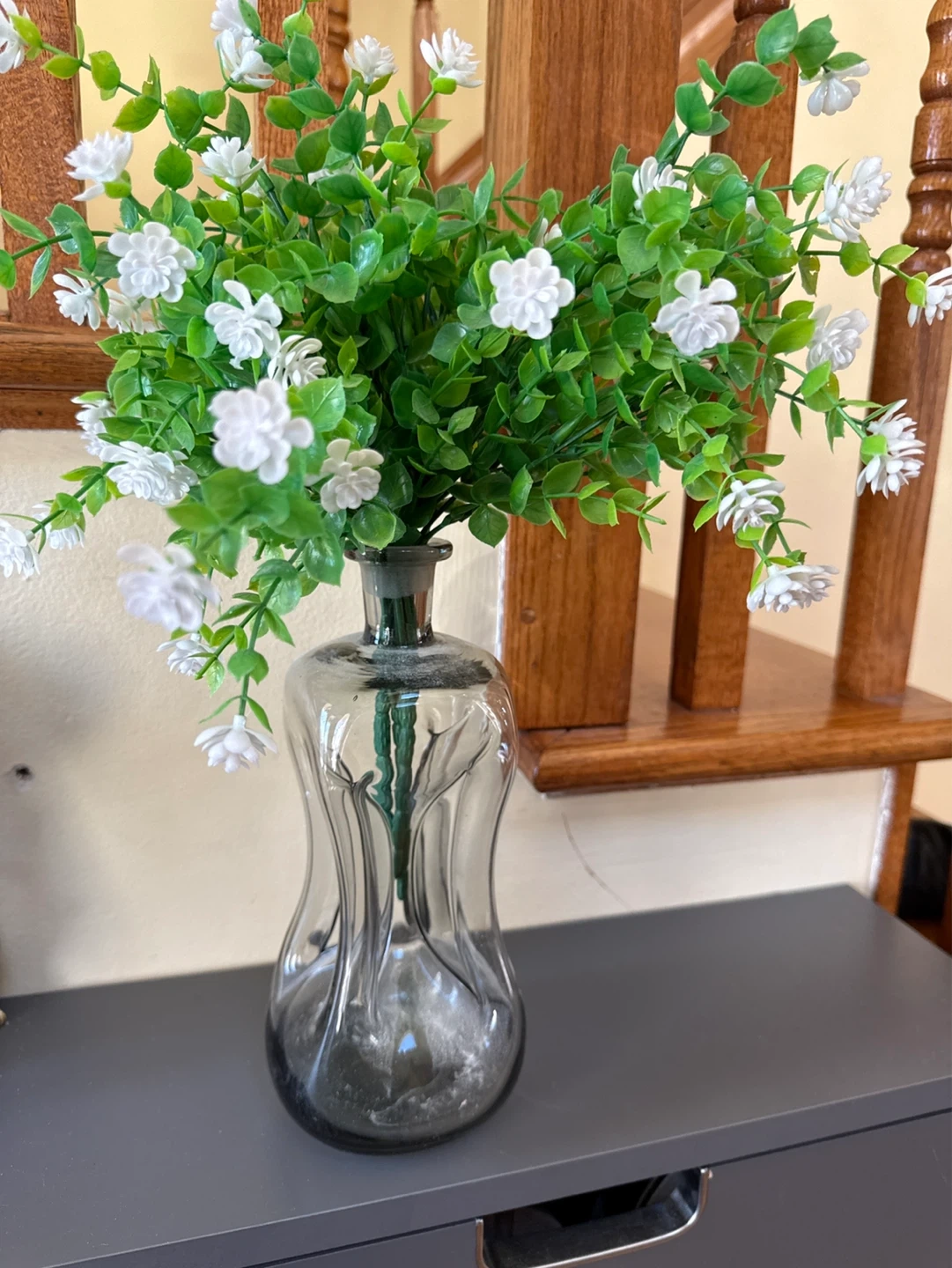 This is a decorative artificial flower arrangement with white blooms and green foliage. It's housed in a clear, smoked glass vase with a unique shape. Perfect for adding a touch of greenery to any room!