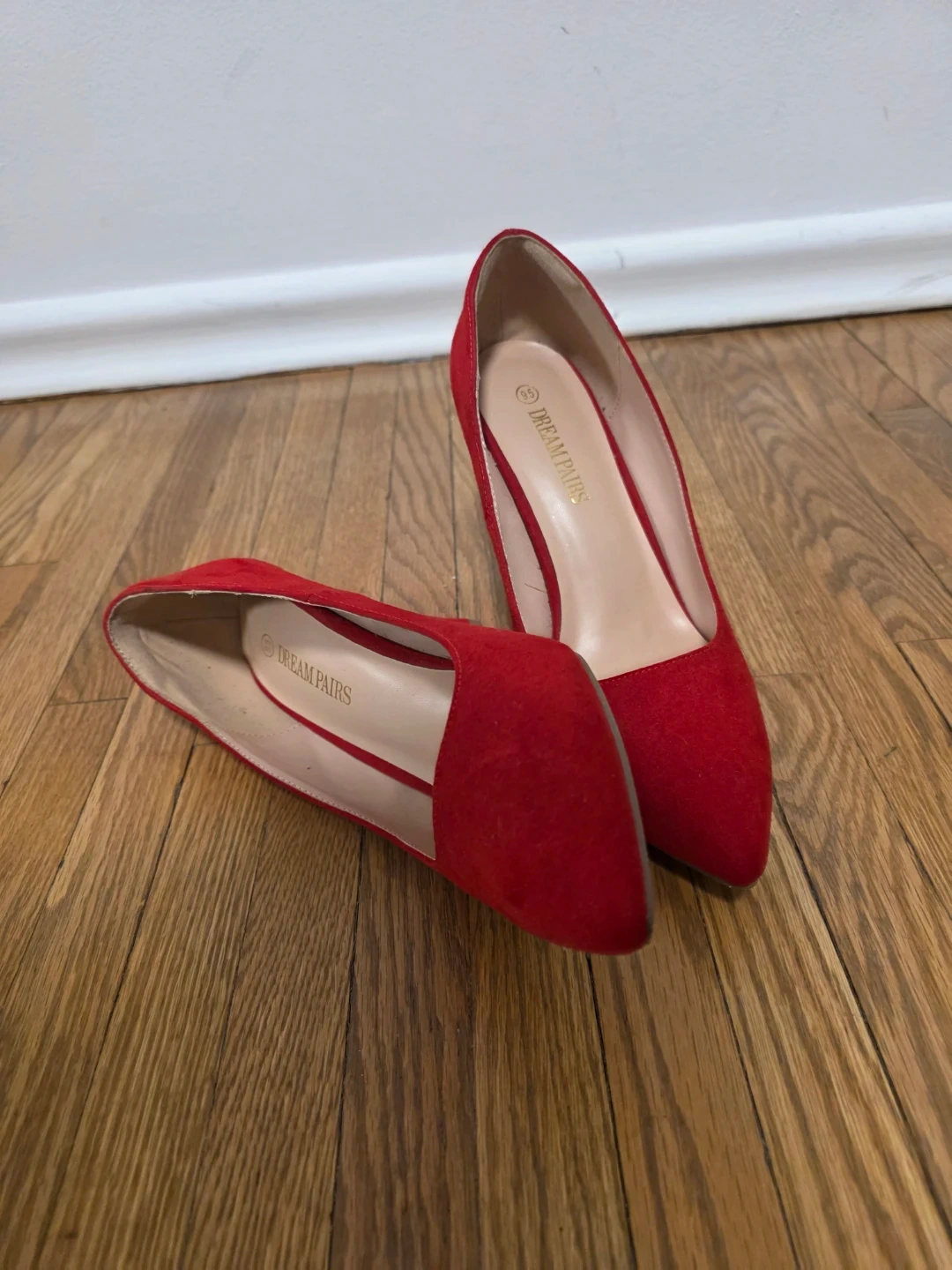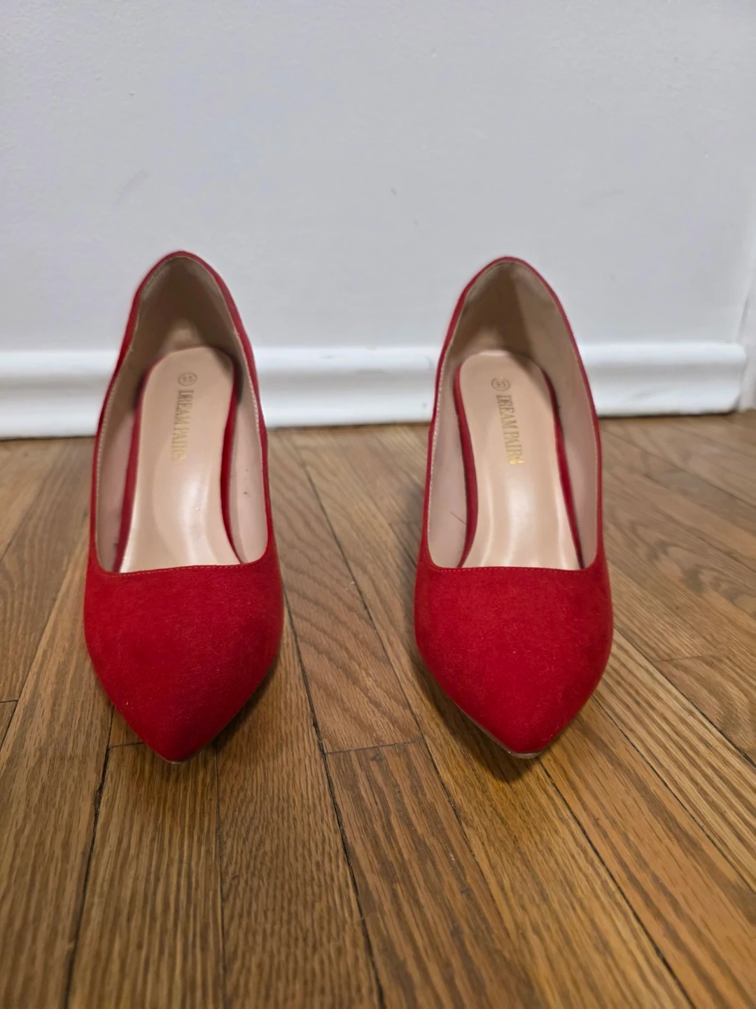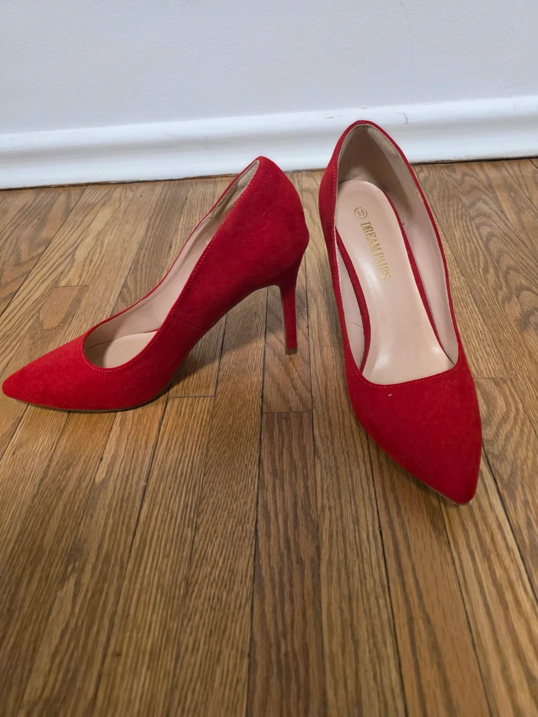 These Dream Pairs stiletto heels are a vibrant red colour. They are made of faux suede material. A classic pump style, perfect for dressing up an outfit!
