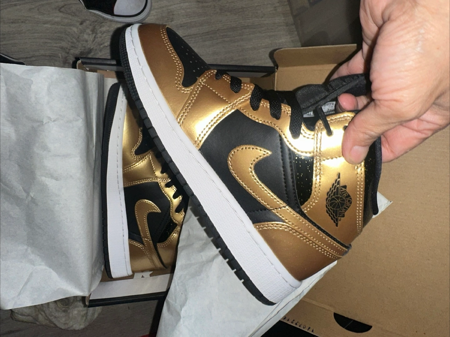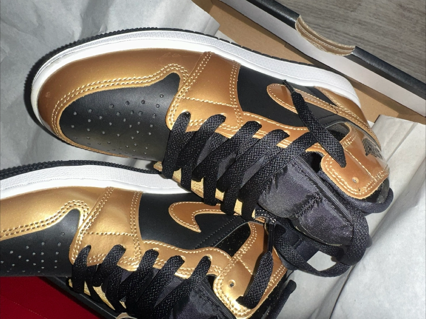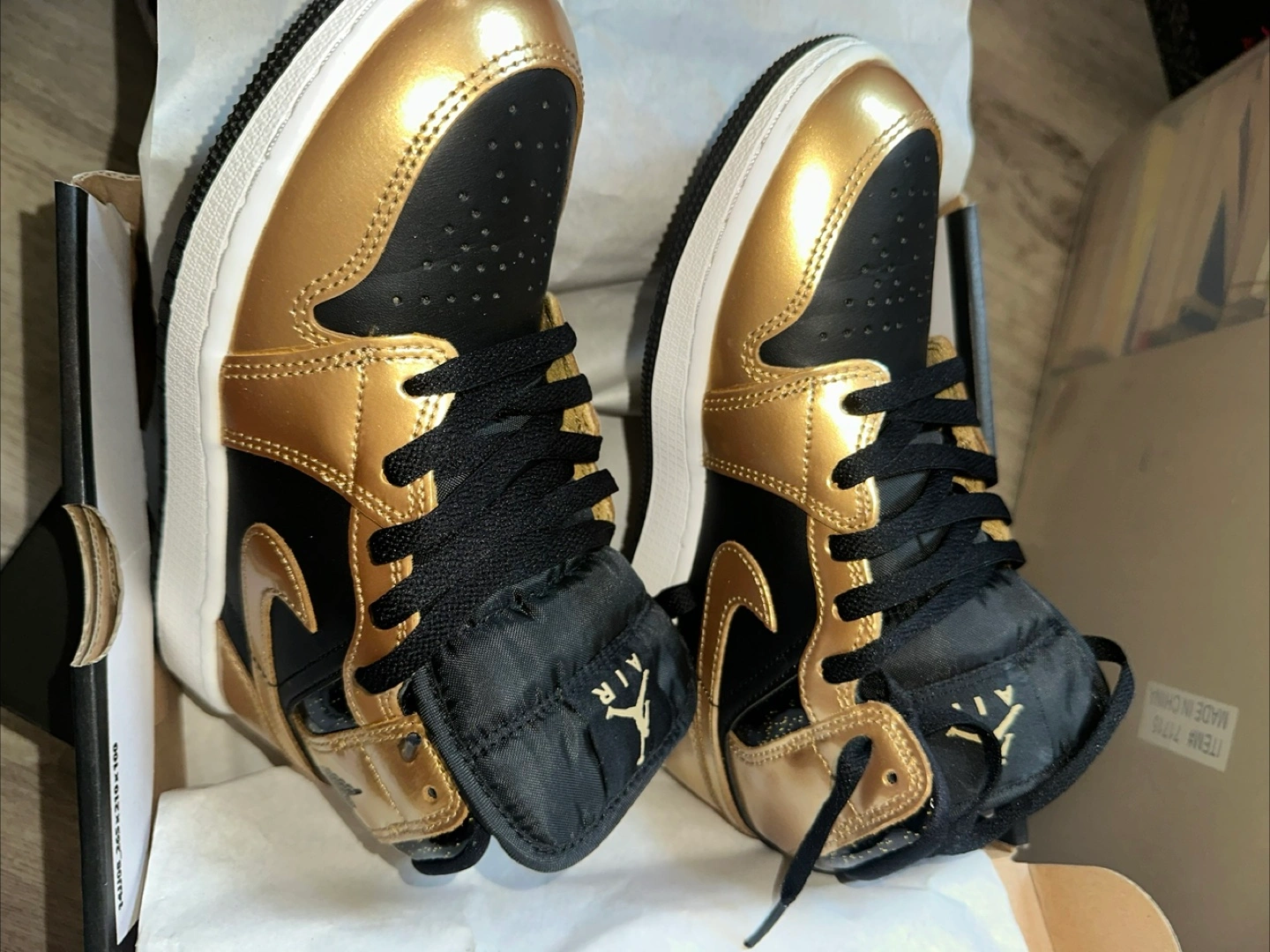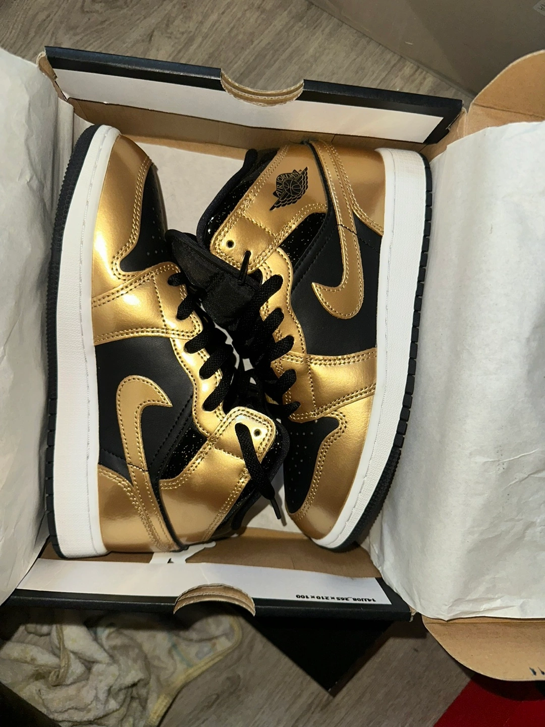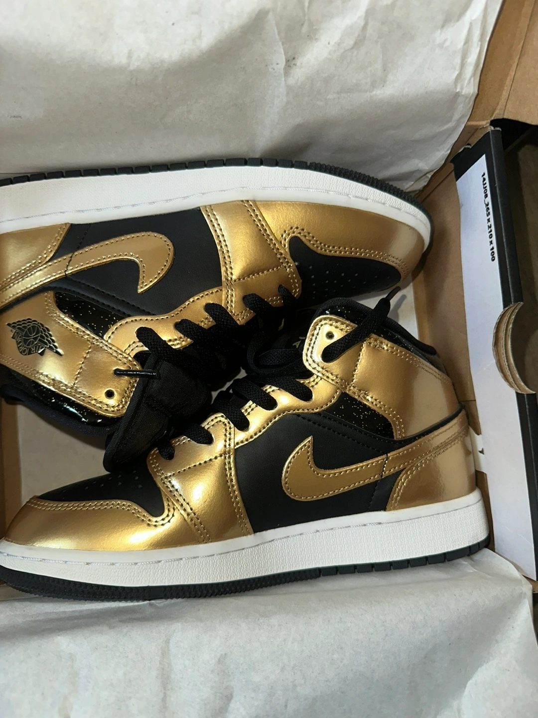 These Air Jordan 1 Mid sneakers feature a shiny gold and black colorway. They come in a mid-top design with black laces. The classic Jordan Wings logo is visible on the side.