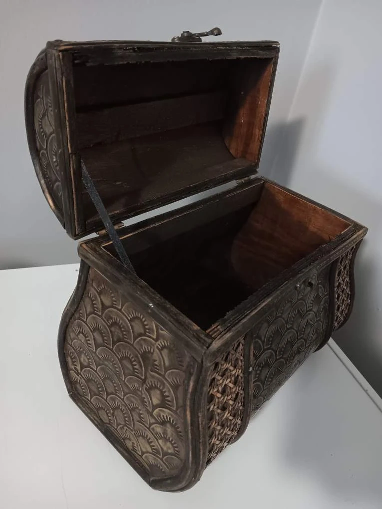 This decorative treasure chest box is made of wood with intricate woven details and a metal clasp. It's perfect for storing small trinkets or keepsakes. The interior is lined and the lid is hinged for easy access.